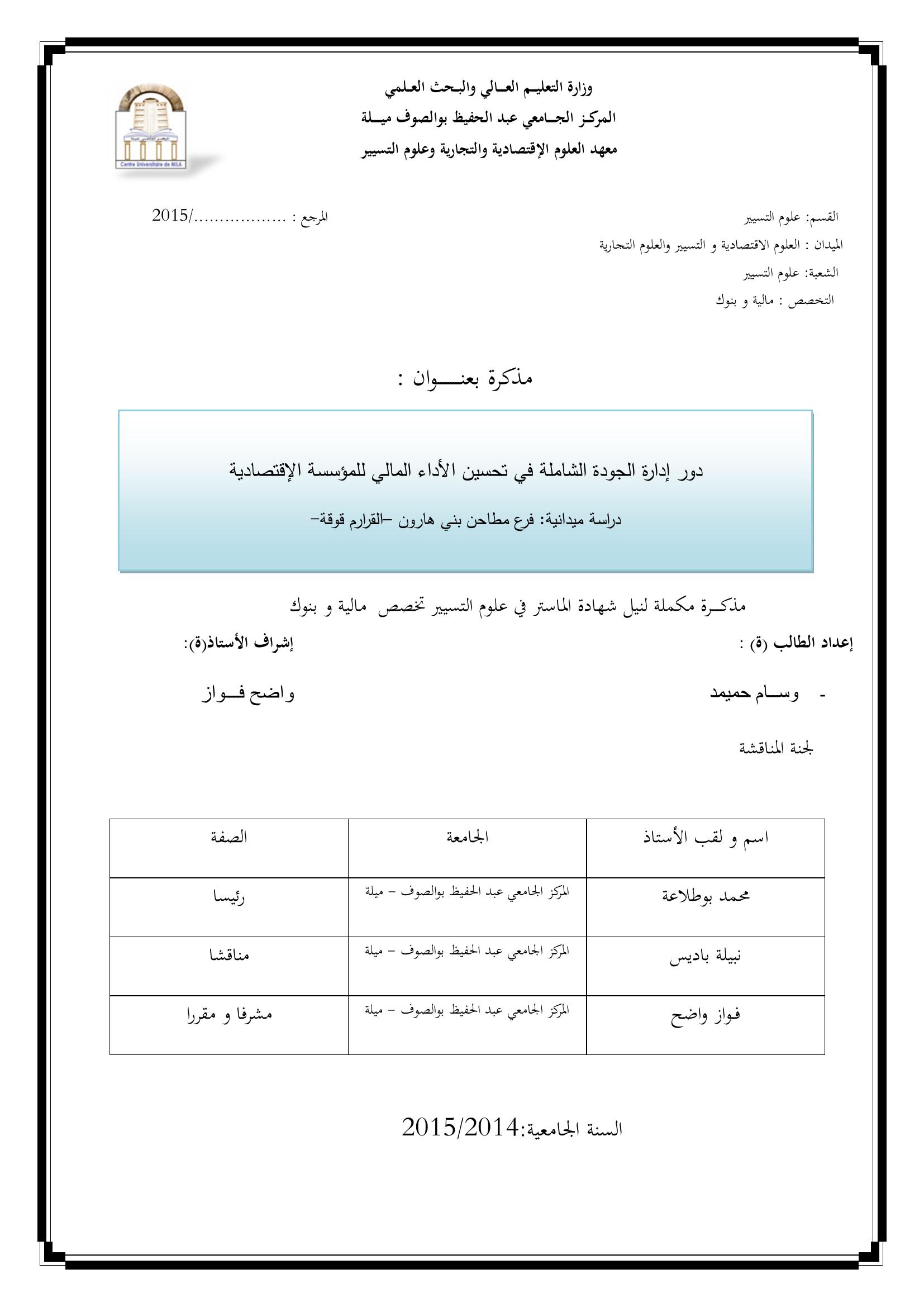 حميمد وسام & ،بوطلاعة محمد (رئيسا) ، نبيلة باديس (مناقشا) ،فواز واضح (مشرفا ومقررا) (2015). دور إدارة الجودة الشاملة في تحسين الأداء المالي للمؤسسة الإقتصادية : فرع مطاحن بني هارون القرارم قوقة.