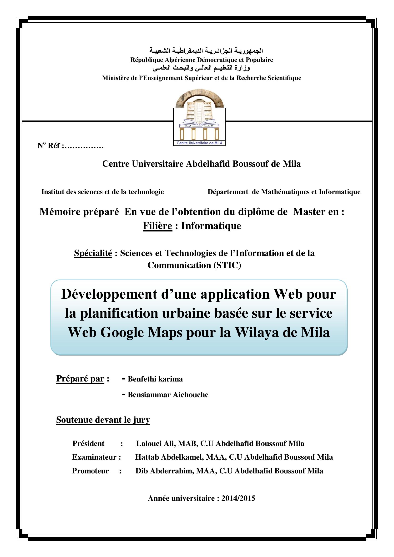 Benfethi karima & Lalouci Ali Président, H. (2015). Développement d'une application web pour la planification urbaine basée sur le service web google maps pour la wilaya de mila.