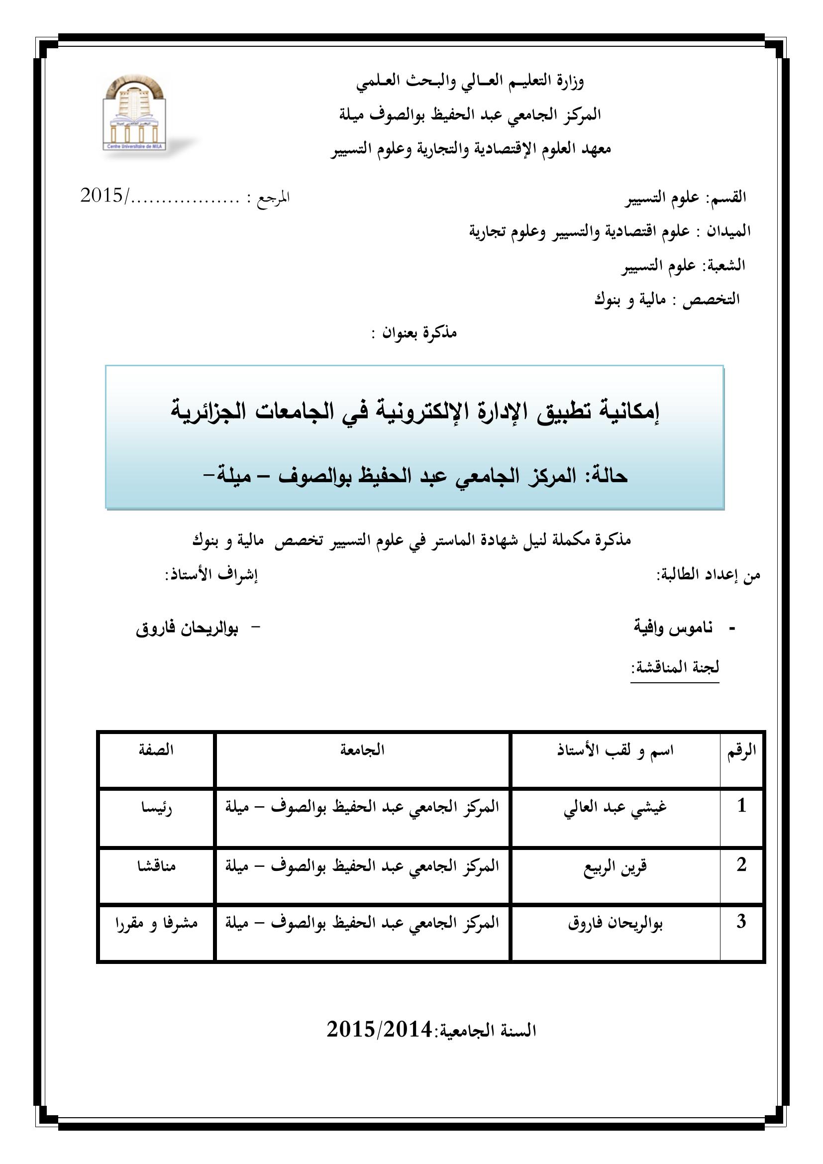 ناموس وافية & ،غيشي عبد العالي(رئيسا)، هولي فرحات(مناقشا)،سنوسي أسامة(مشرفا ومقررا) (2015). إمكانية تطبيق الإدارة الإلكترونية في الجامعات الجزائرية : حالة المركز الجامعي عبد الحفيظ بوالصوف ميلة (ماستر- ل م د) .