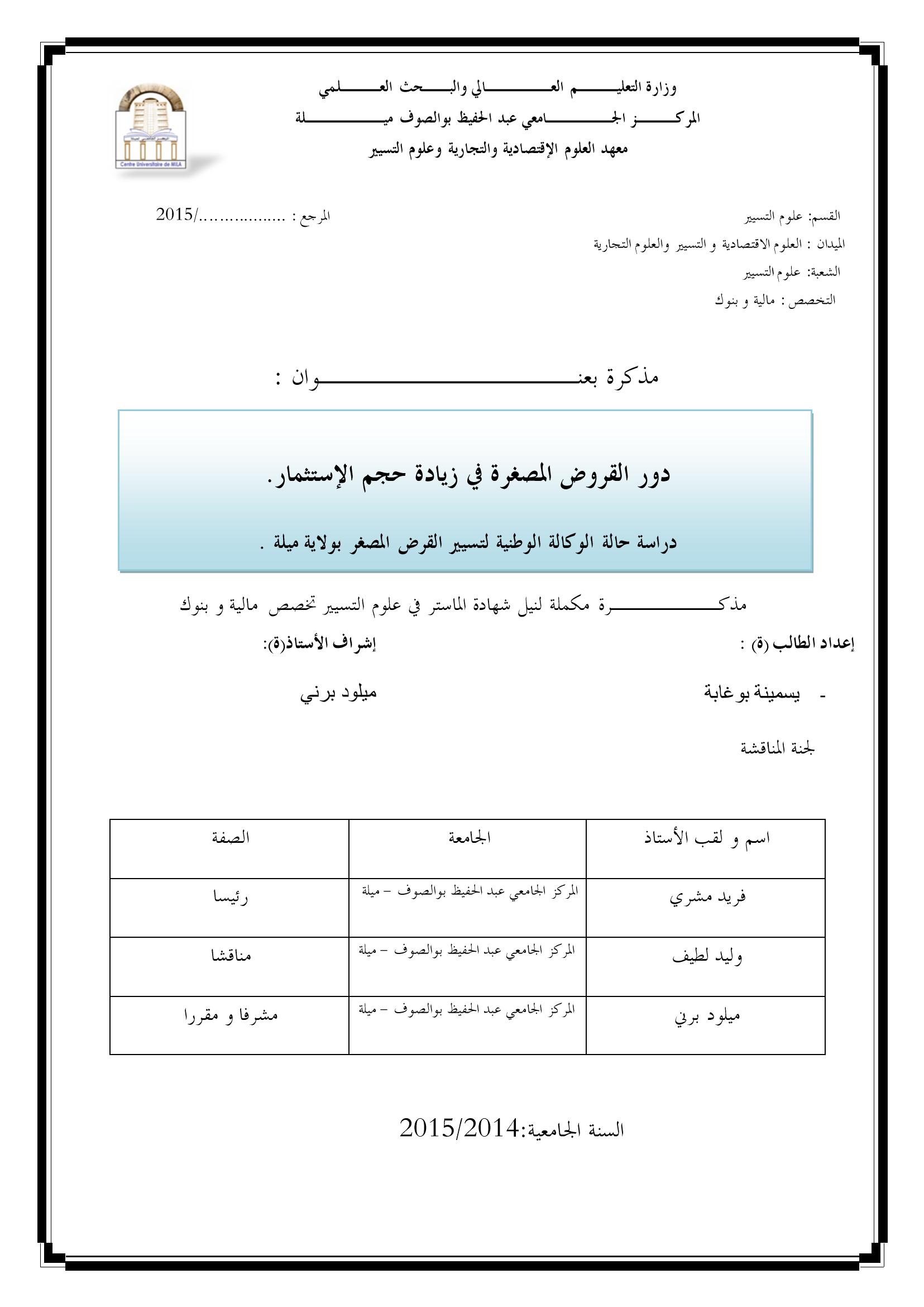 بوغابة يسمينة & مشري فريد(رئيسا)، وليد لطيف (مناقشا)، ميلود برني(مشرفا ومقررا) (2015). دور القروض المصغرة في زيادة حجم الإستثمار : دراسة حالة الوكالة الوطنية لتسيير القرض المصغر بولاية ميلة.