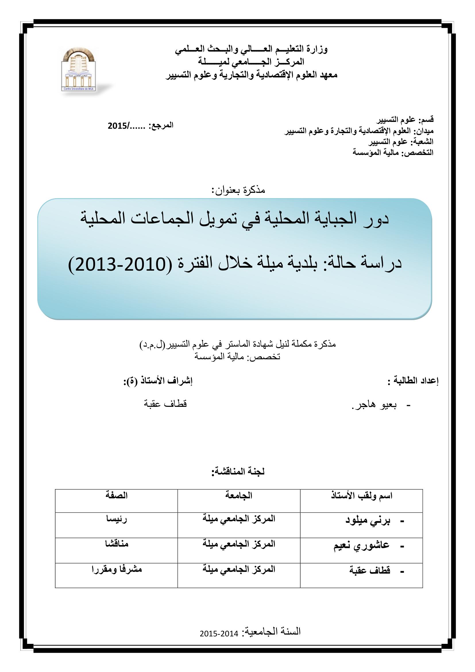 هاجر بعيو & ،برني ميلود(رئيسا)، عاشوري نعيم(مناقشا)، قطاف عقبة(مشرفا ومقررا) (2015). دور الجباية المحلية في تمويل الجماعات المحلية : دراسة حالة بلدية ميلة خلال الفترة (2010-2013).