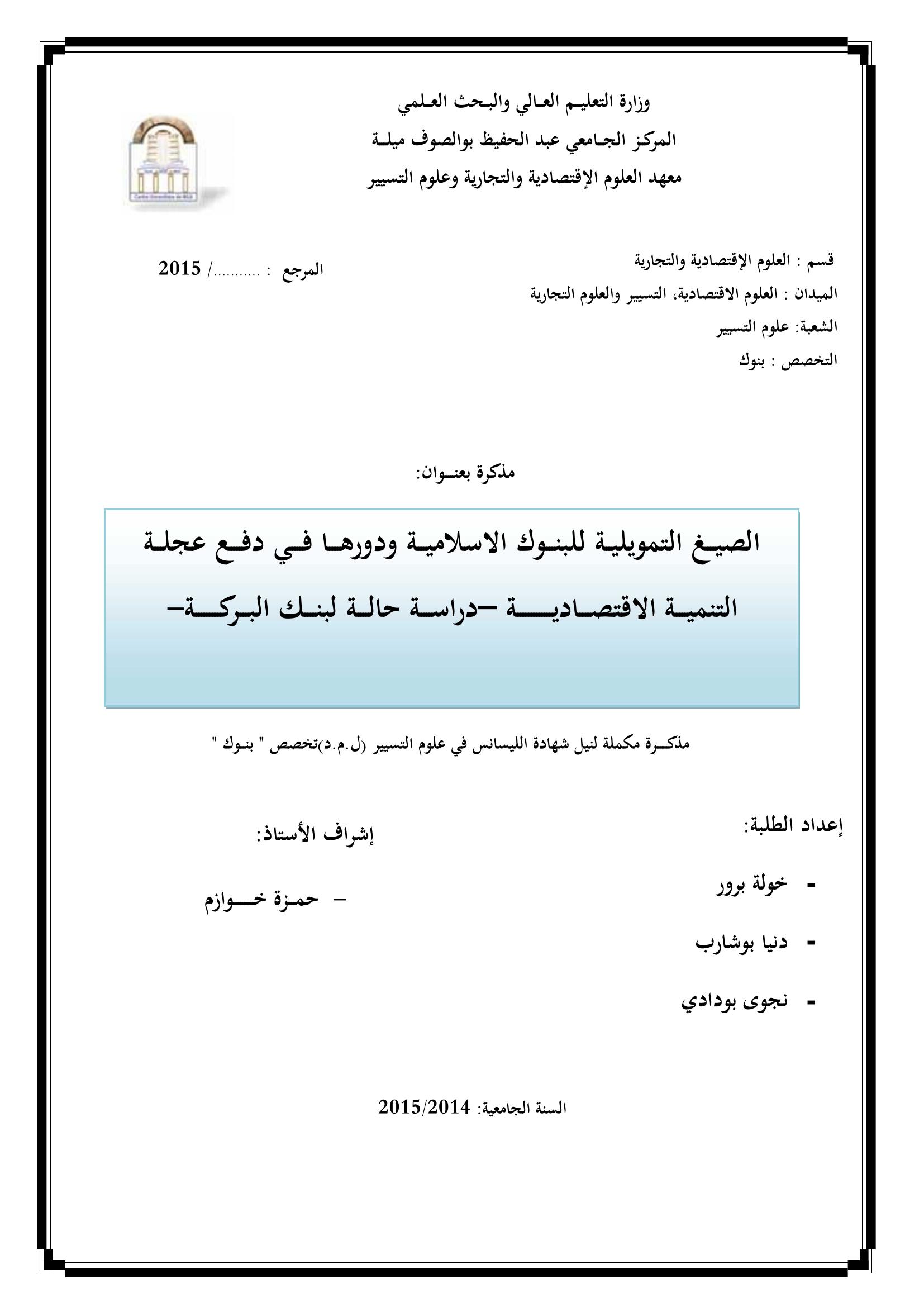 برور خولة & خوازم حمزة(مشرفا) (2015). الصيغ التمويلية في البنوك الإسلاميةودورها في دفع عجلة التنمية الإقتصادية : دراسة حالة بنك البركة.