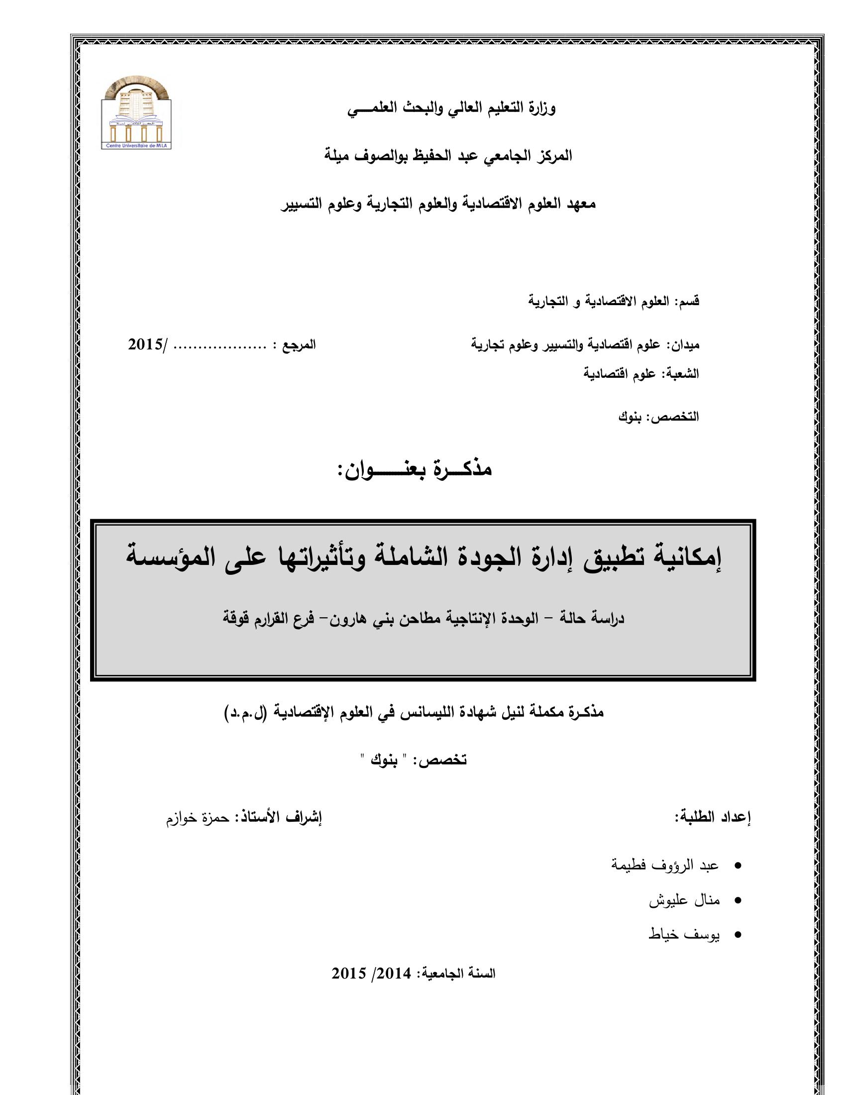 عبد الرؤوف فطيمة & خوازم حمزة(مشرفا) (2015). إمكانية تطبيق الجودة الشاملة وتأثيراتها على المؤسسة : دراسة حالة الوحدة الإنتاجية مطاحن بني هارون فرع القرارم قوقة.