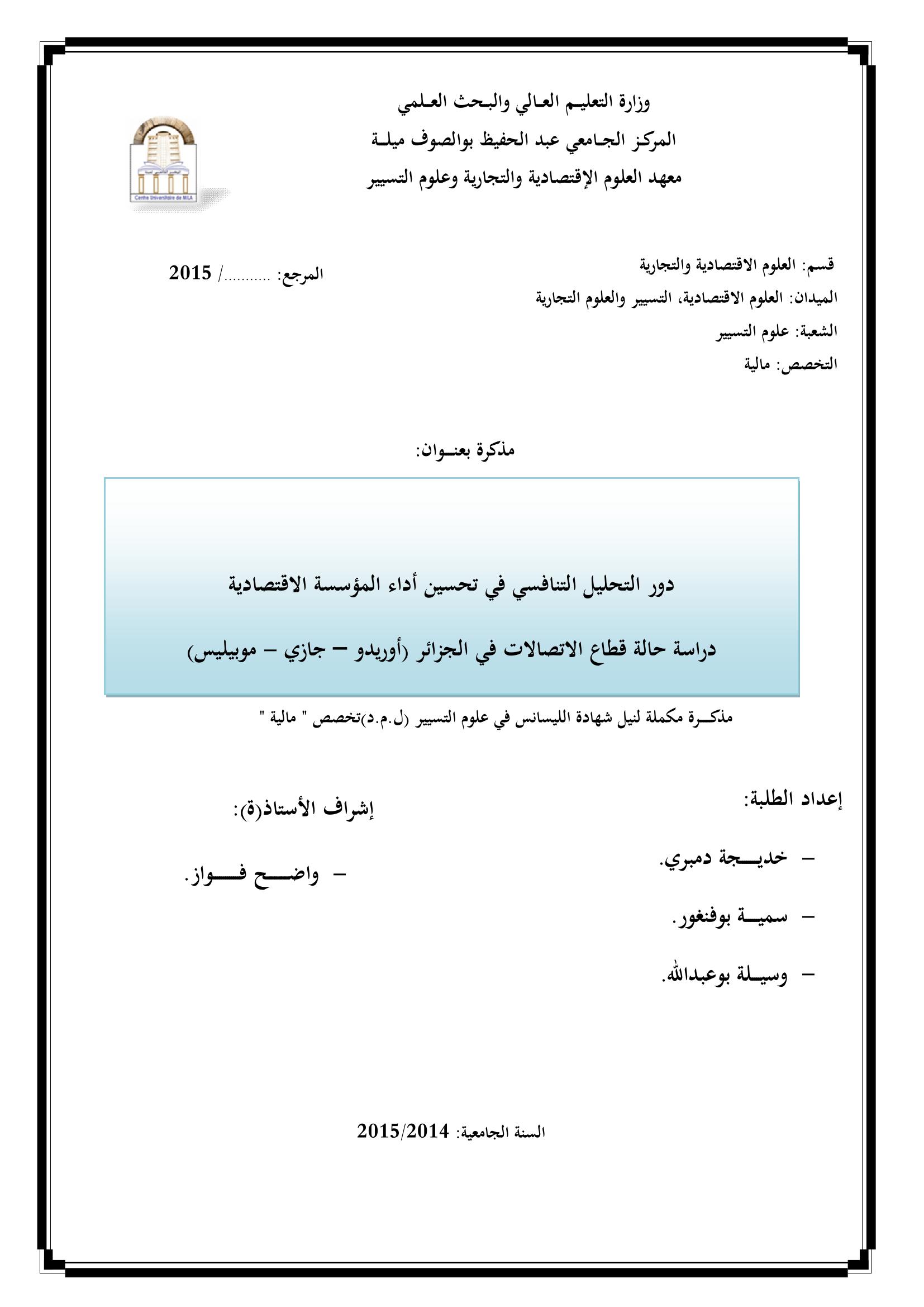 دمبري خديجة & واضح فواز (مشرفا) (2015). دور التحليل التنافسي في تحسين أداء المؤسسة الإقتصادية : دراسة حالة قطاع الإتصالات في الجزائر (أوريدو -جازي -موبيليس) (ليسانس- ل م د) .