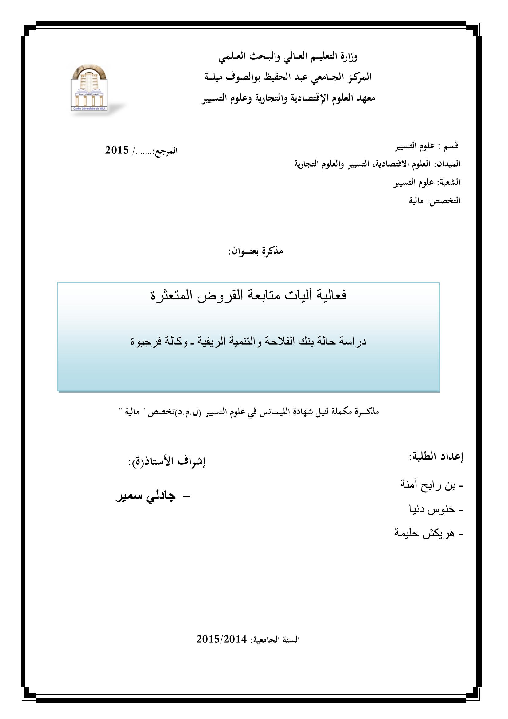 فعالية آليات متابعة القروض المتعثرة : دراسة حالة بنك الفلاحة والتنمية الريفية وكالة فرجيوة