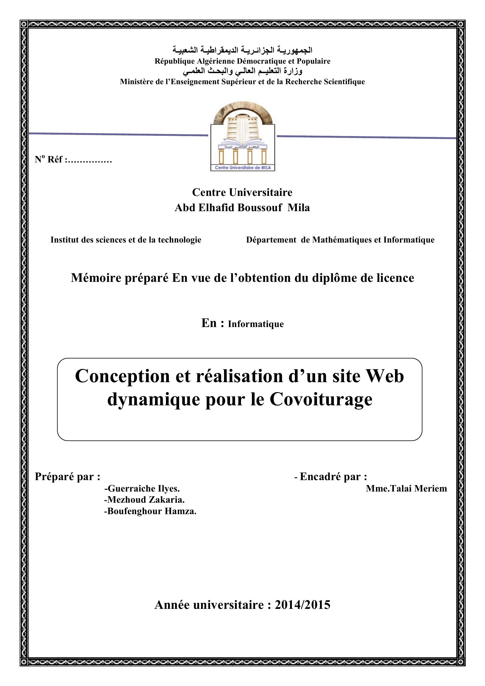 Guerraiche Ilyes (2015). Conception et réalisation d'un site web dynamique pour le covoiturage.