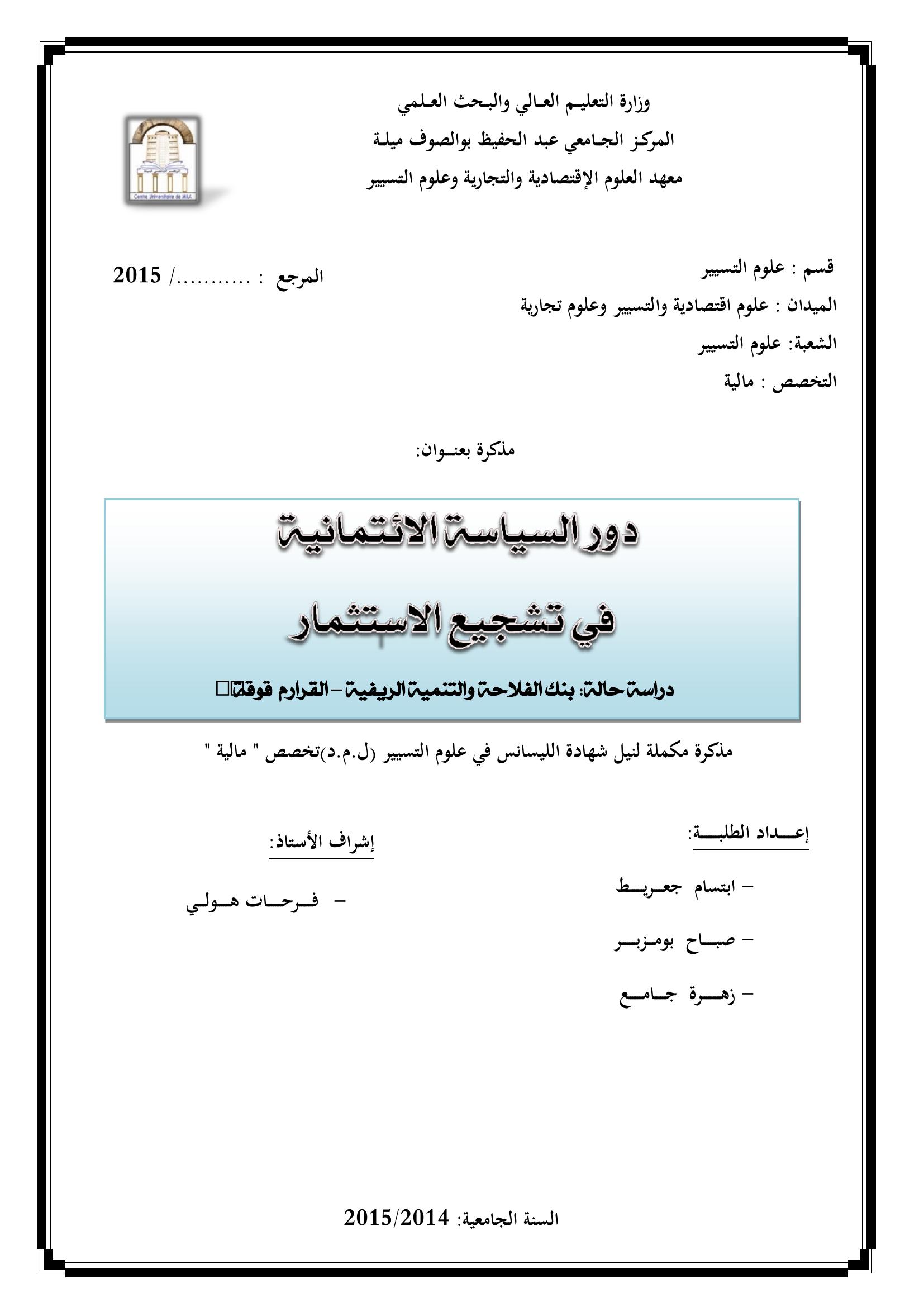 جعريط إبتسام & هولي فرحات (مشرفا) (2015). دور السياسة الإئتمانية في تشجيع الإستثمار: دراسة حالة بنك الفلاحة والتنمية الريفية القرارم قوقة.