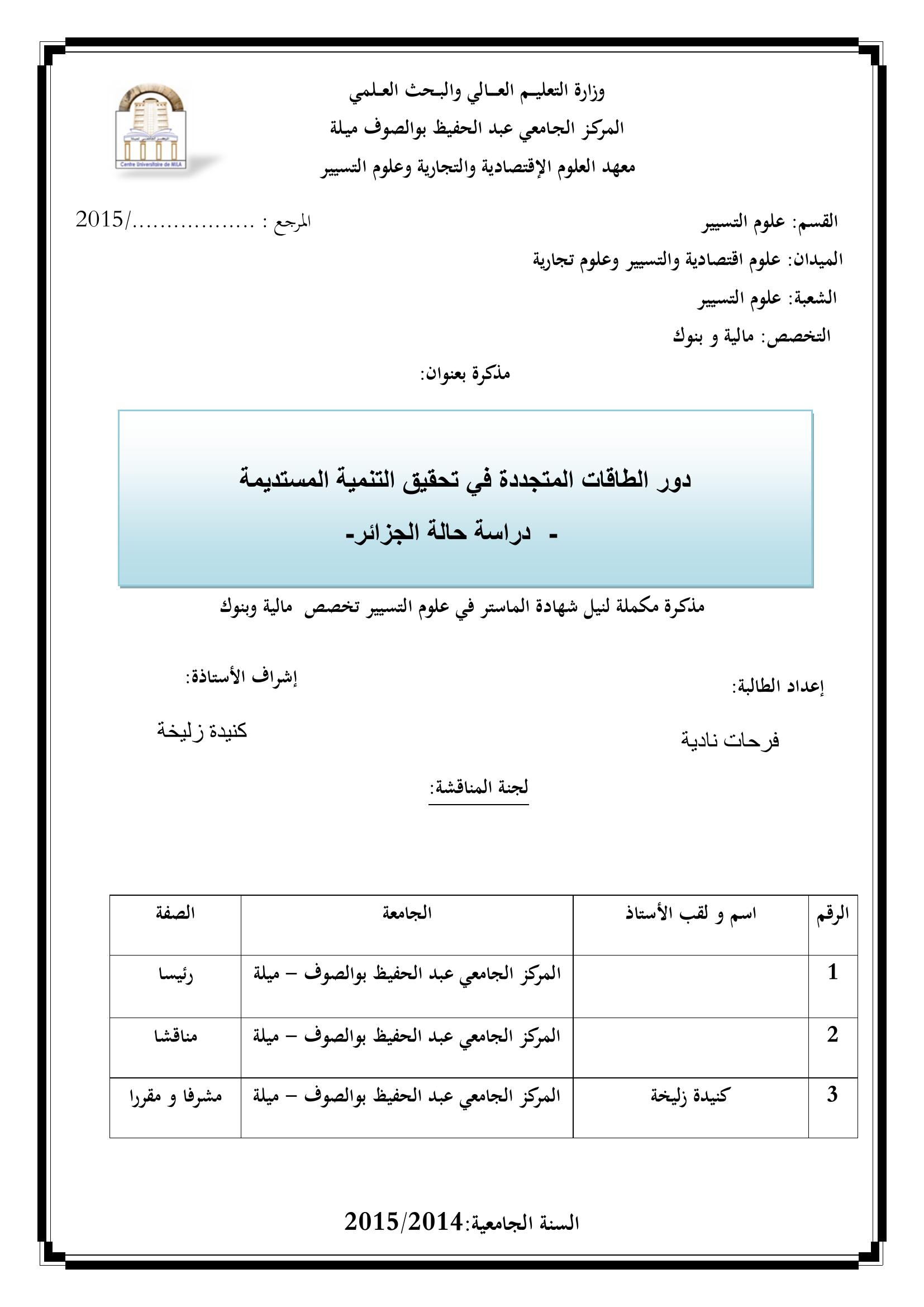 فرحات نادية & كنيدة زليخة (مشرفا) (2015). دور الطاقات المتجددة في تحقيق الميزة المستديمة دراسة حالة الجزائر.