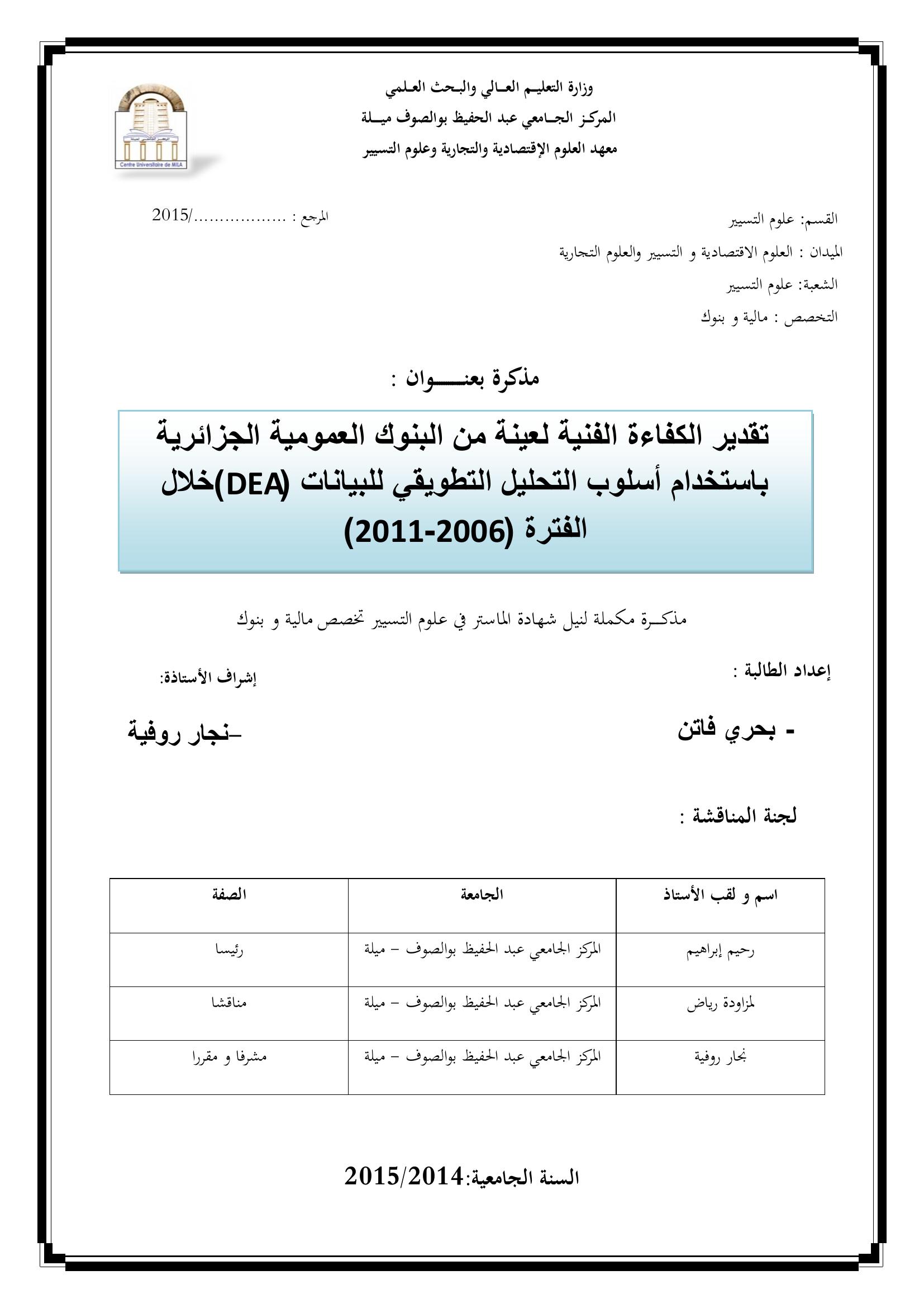 بحري فاتن & ،رحيم ابراهيم(رئيسا)، لمزاودة رياض(ماقشا)، نجار روفية(مشرفا ومقررا) (2015). تقدير الكفاءة الفنية لعينة من البنوك العمومية الجزائرية بإستخدام أسلوب التحليل التطويقي للبيانات (DEA) خلال الفترة (2006-2011).