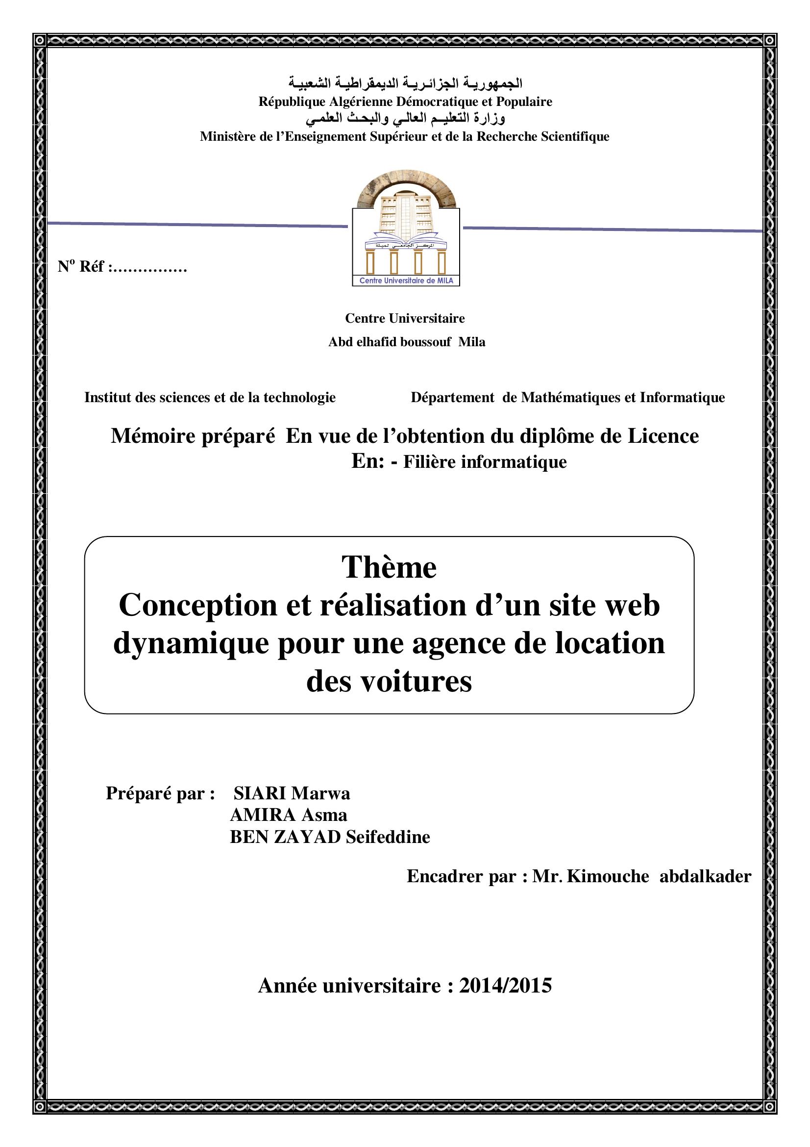 Siari Marwa (2015). Conception et réalisation d'un site web dynamique pour une agence de location des voitures.