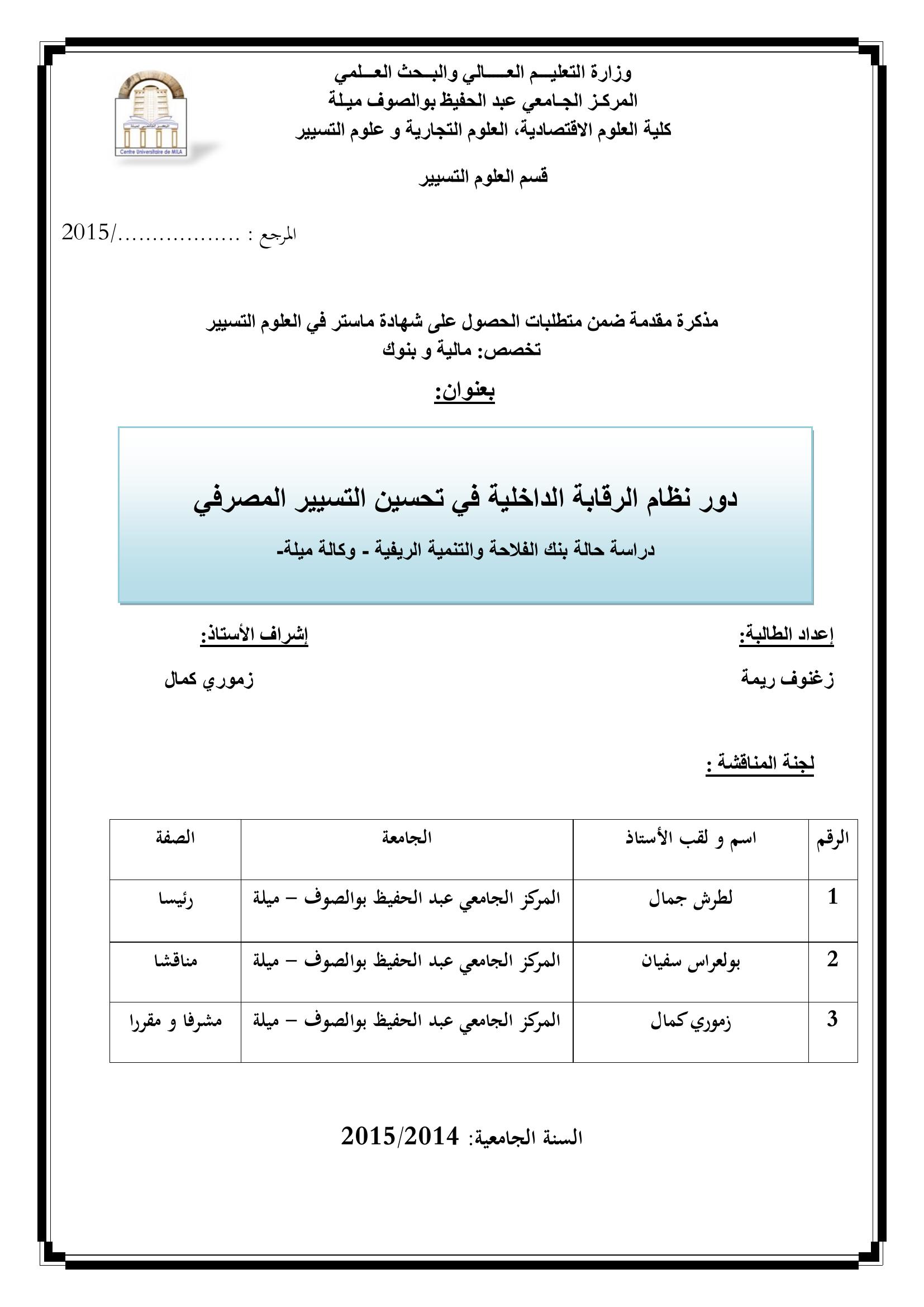 زغنوف ريمة & ،لطرش جمال(رئيسا)، بولعراس سفيان(مناقشا)، زموري كمال(مشرفا ومقررا) (2015). دور نظام الرقابة الداخلية في تحسين التسيير المصرفي : دراسة حالة بنك الفلاحة والتنمية الريفية وكالة ميلة.