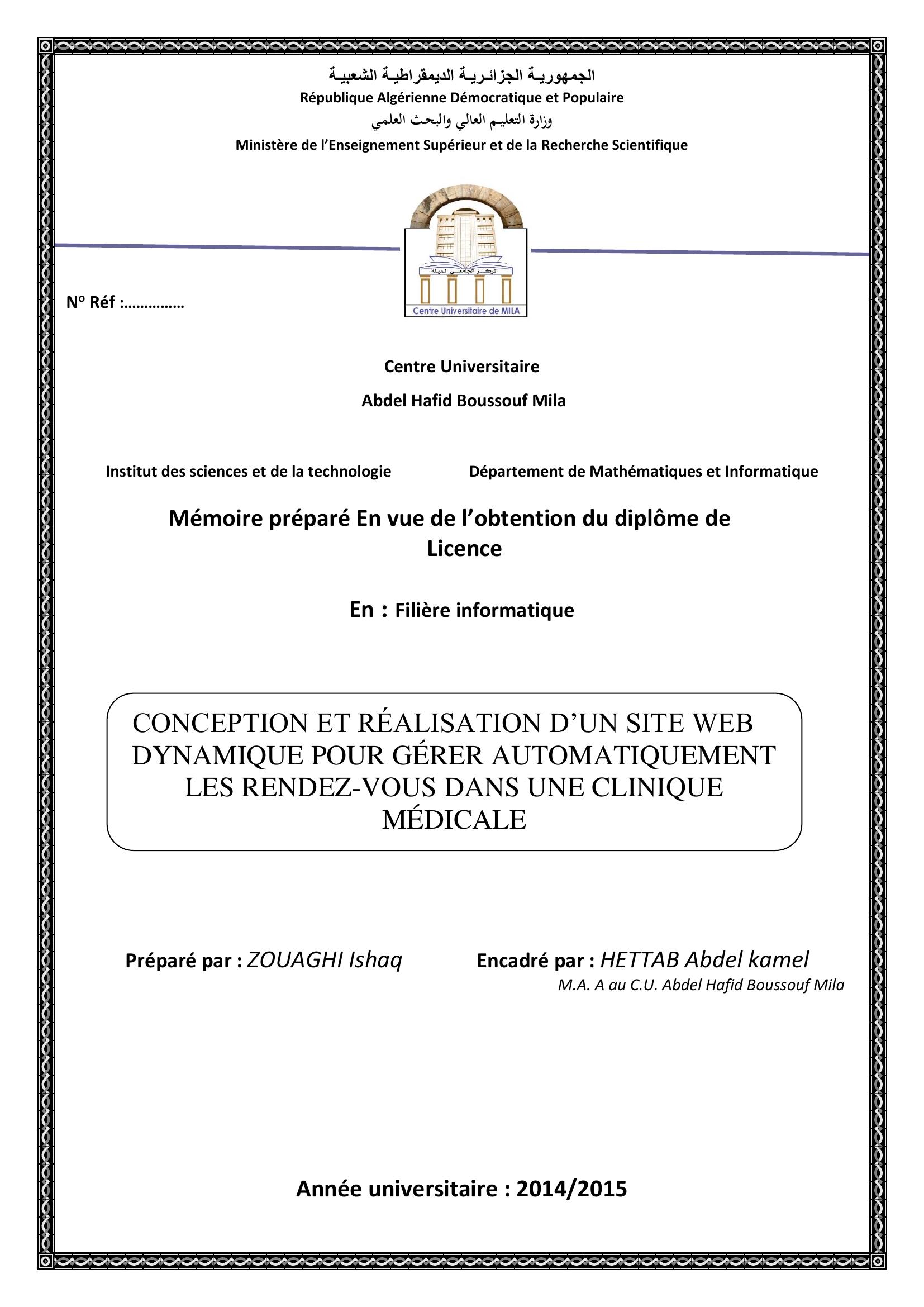 Zouaghi Ishaq (2015). Conception et réalisation d'un site web dynamique pour gérer automatiquement les rendez-vous dans une clinique médicale.