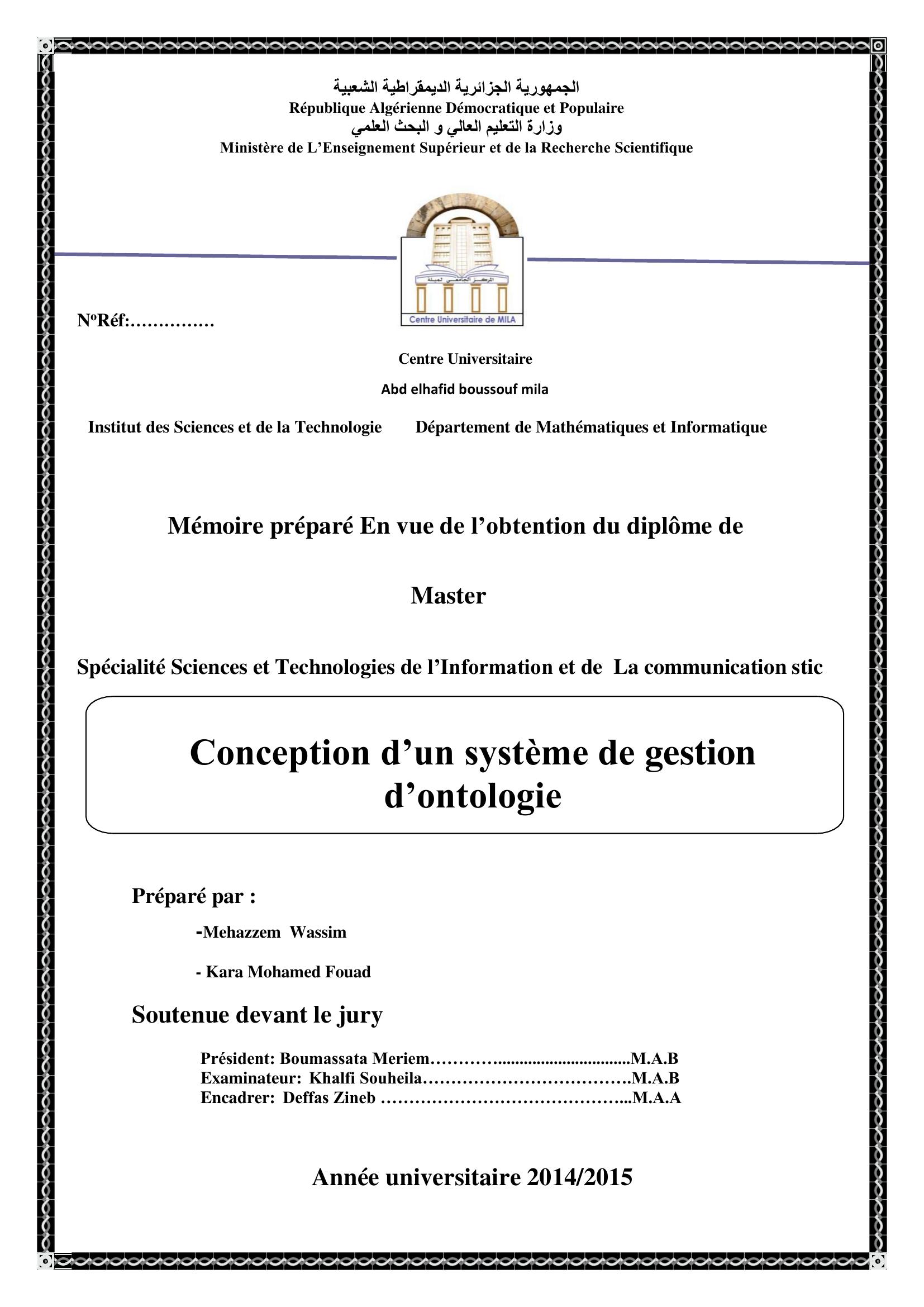 Mehazzem Wassim (2015). Conception d'un système de gestion d'ontologie.