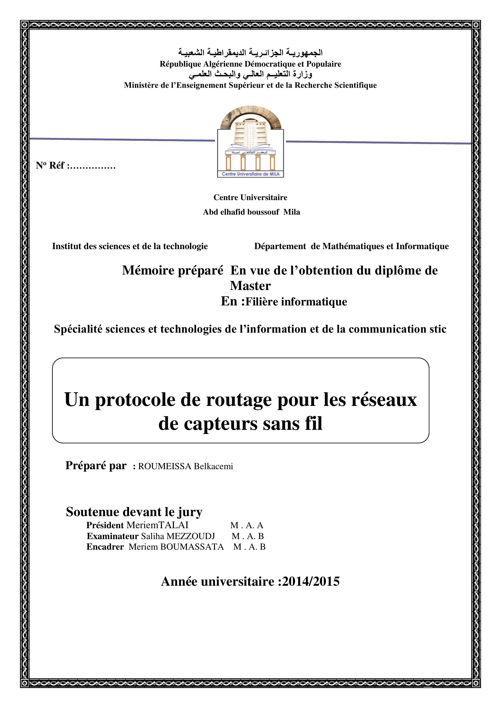 Belkacemi Roumeissa (2015). Un protocole de routage pour les réseaux de capteurs sans fil.