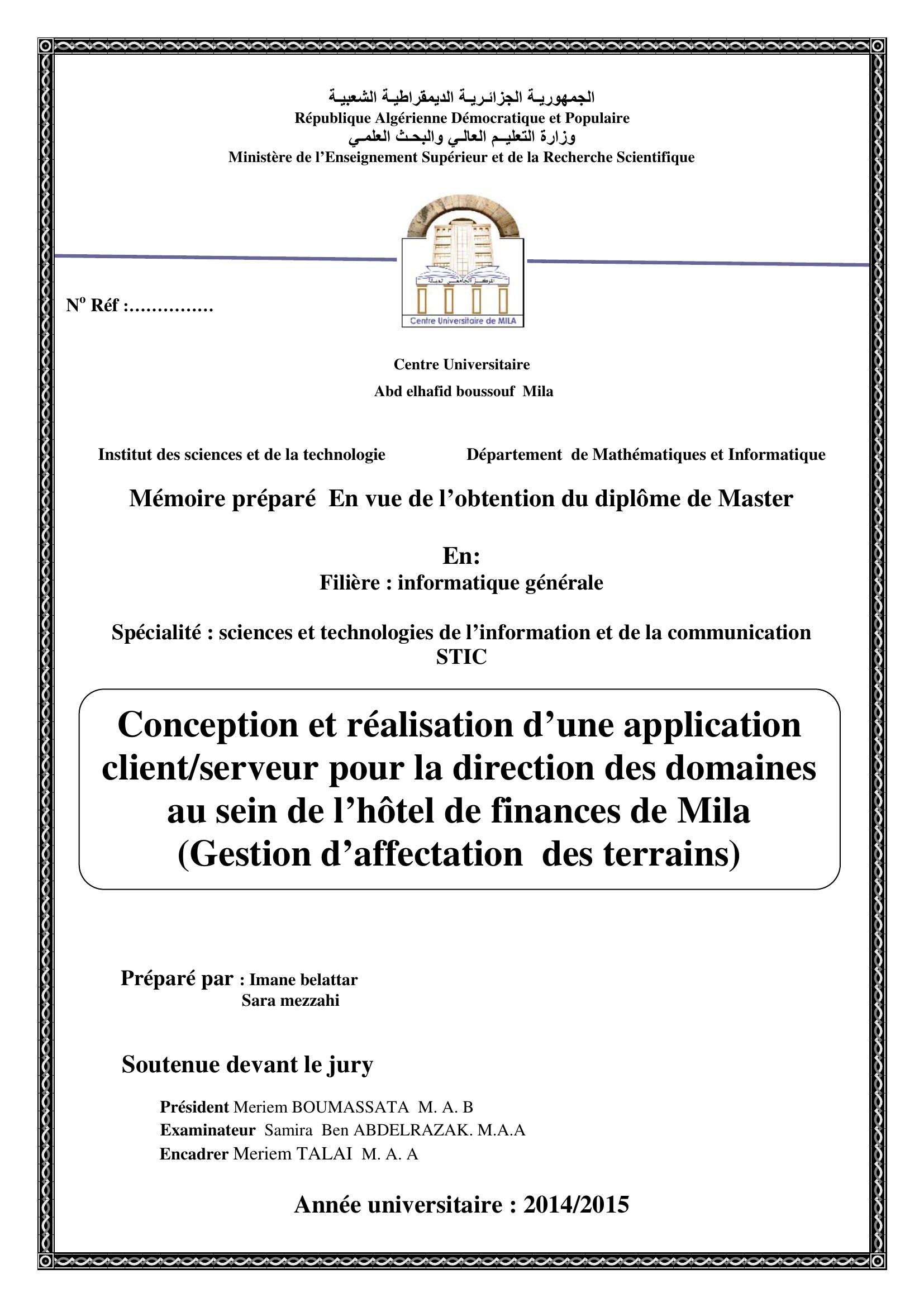 Belattar Imane (2015). Conception et réalisation d'une application client/serveur pour la direction des domaines au sein de l'hotel de finances de mila (gestion d'affectation des terrains ).
