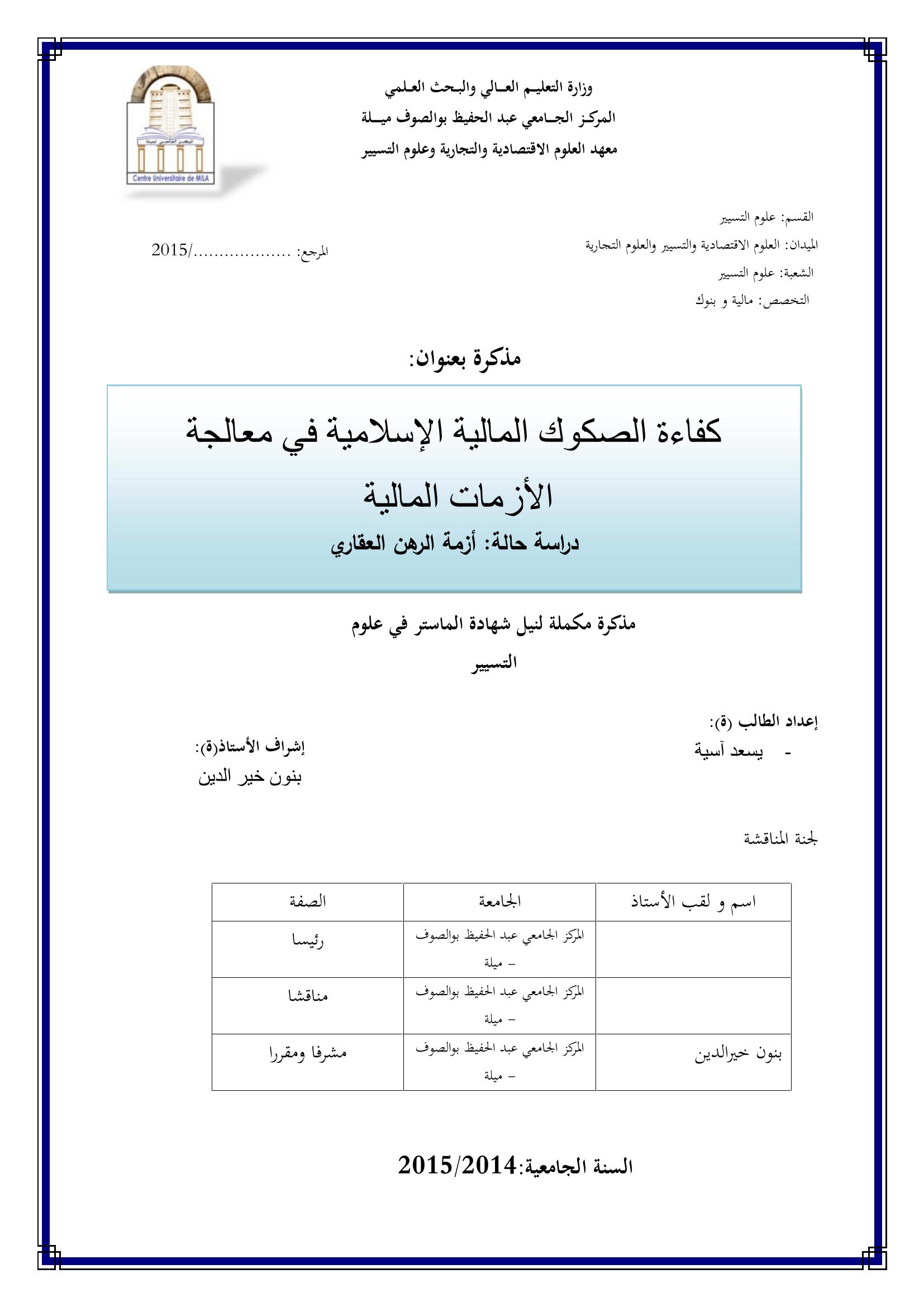 يسعد أسية & بنون خير الدين(مشرفا) (2015). كفاءة الصكوك المالية الإسلامية في معالجة الأزمات المالية : دراسة حالة أزمة الرهن العقاري.