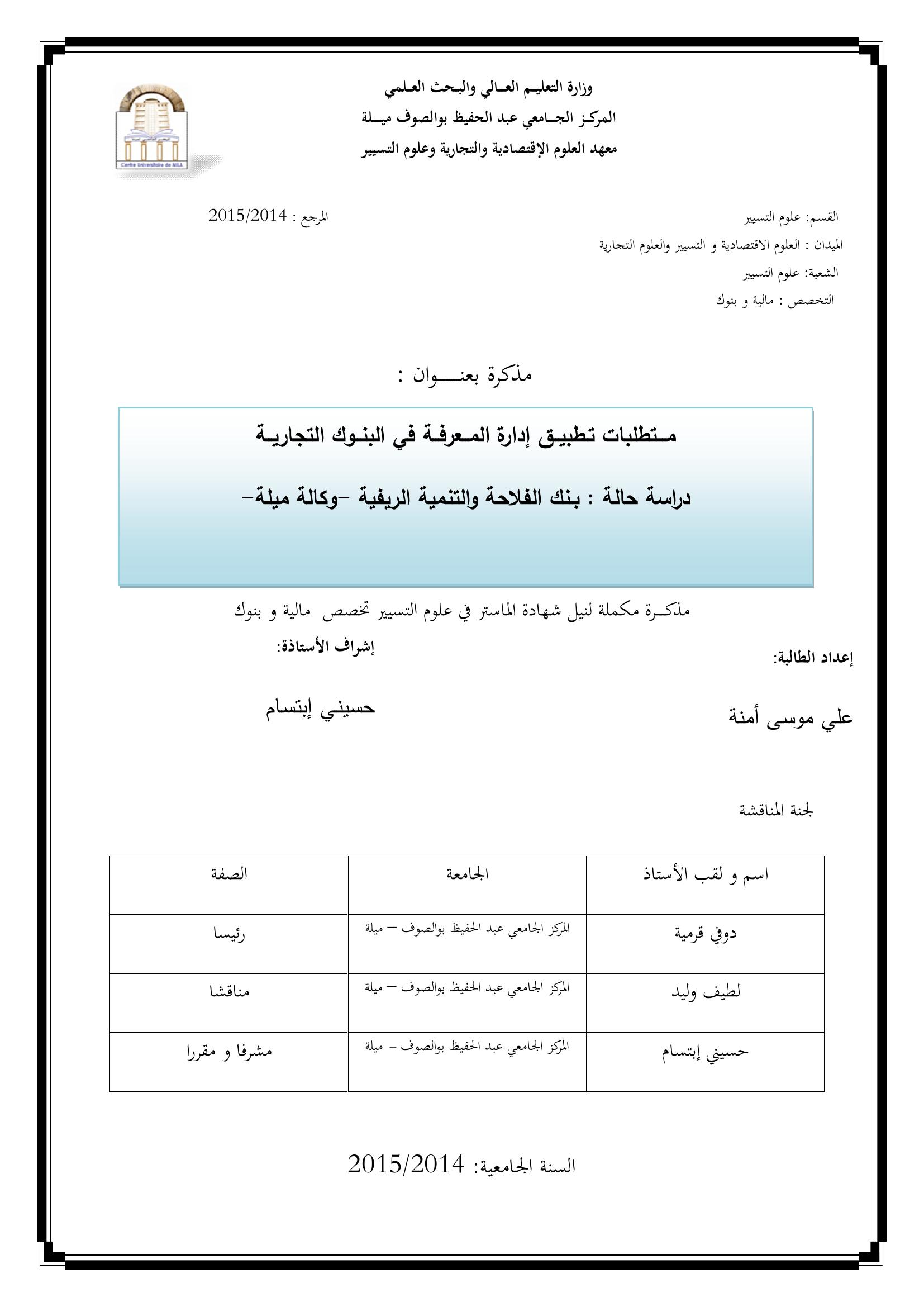 علي موسى أمنة & ،دوفي قرمية(رئيسا)، لطيف وليد(مناقشا)، حسيني ابتسام(مشرفا ومقررا) (2015). متطلبات تطبيق إدارة المعرفة في البنوك التجارية : دراسة حالة بنك الفلاحة والتنمية الريفية وكالة ميلة.