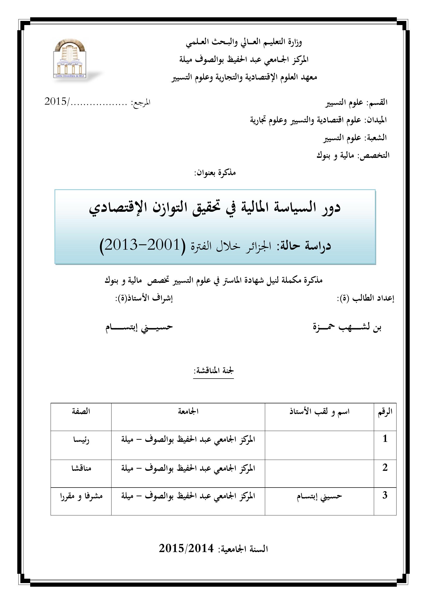 بن لشهب حمزة & حسيني ابتسام(مشرفا) (2015). دور السياسة المالية في تحقيق التوازن الإقتصادي دراسة حالة الجزائر خلال الفترة (2001-2013).