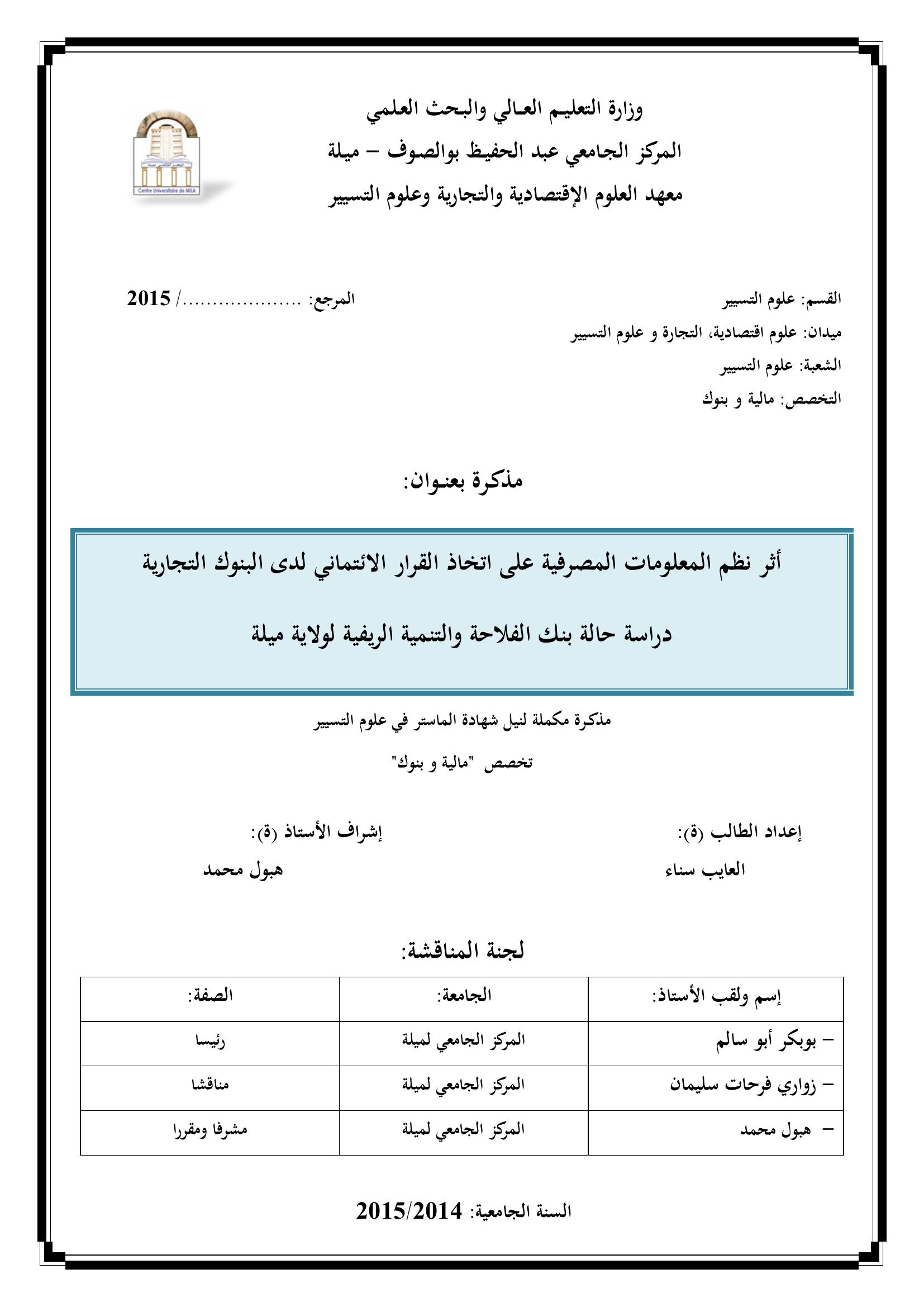 سناء العايب & ،أبوبكرأبوسالم(رئيسا), ز. (2015). أثر نظم المعلومات المصرفية على اتخاذ القرار الإئتماني لدى البنوك التجارية : دراسة حالة بنك الفلاحة والتنمية الريفية لولاية ميلة.