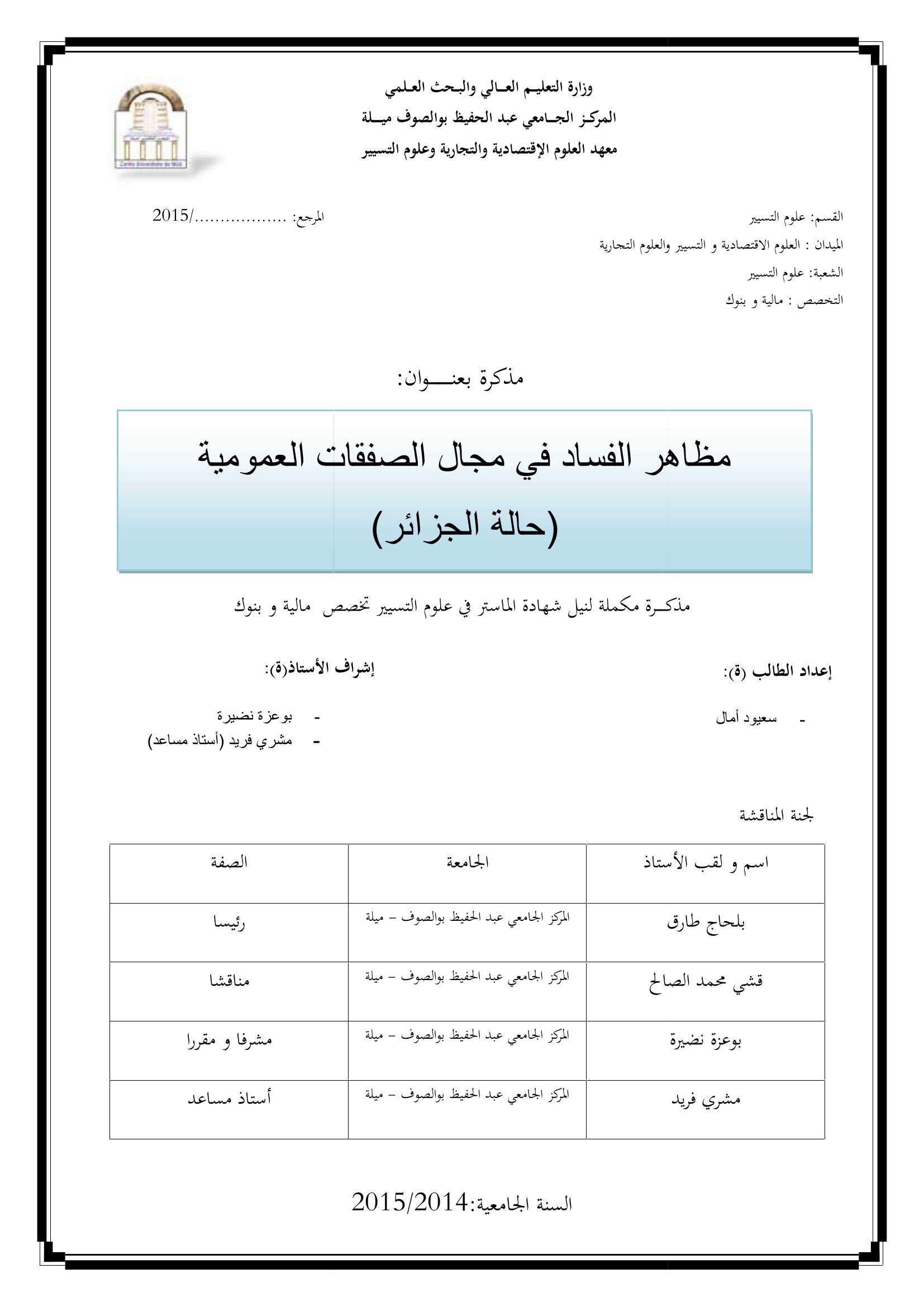 سعيود أمال & ،طارق بلحاج(زئيسا)، قشي مجمد الصالح(مناقشا)، بوعزة نضيرة(مشرفا ومقررا) (2015). مظاهر الفساد في مجال الصفقات العمومية (حالة الجزائر ).