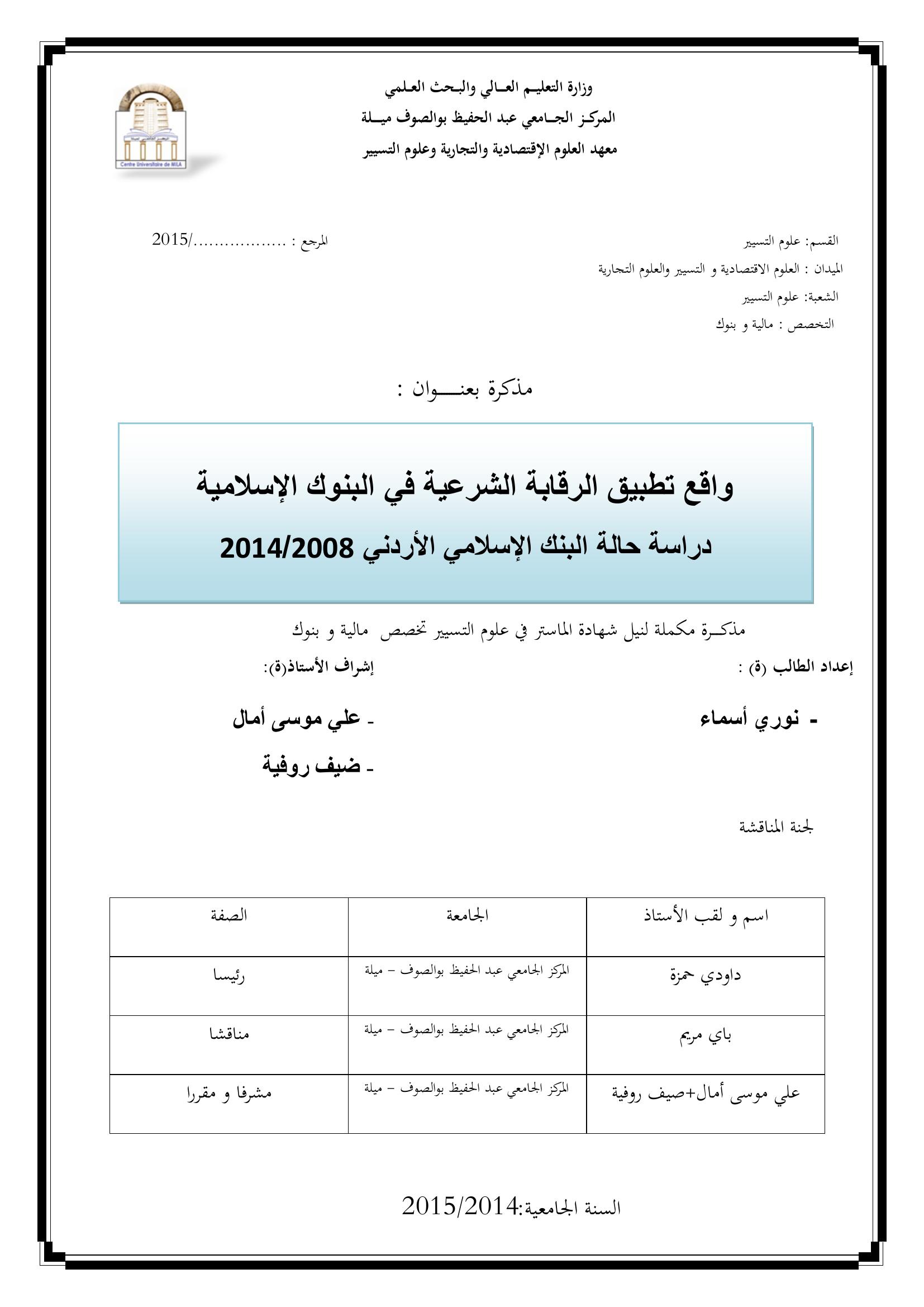 نوري أسماء & ،داودي حمزة(رئيسا)، باي مريم(مناقشا)، علي موسى أمال+ضيف روفية(مشرفا ومقررا) (2015). واقع تطبيق الرقابة الشرعية في البنوك الإسلامية : دراسة حالة البنك الإسلامي الأردني 2008/2014.