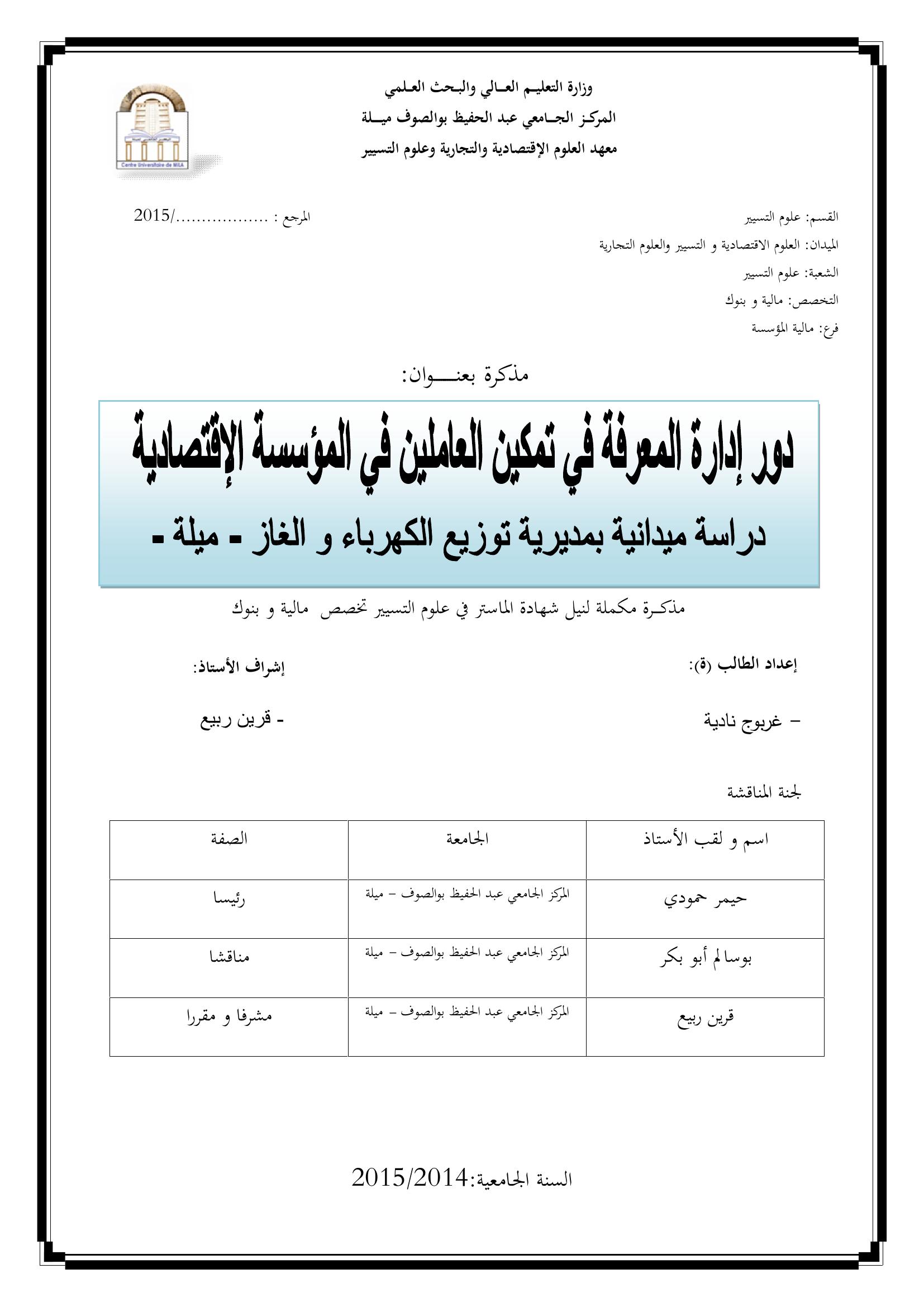 غربوج نادية (2015). دور إدارة المعرفة في تمكين العاملين في المؤسسة الإقتصادية : دراسة ميدانية بمديرية توزيع الكهرباء والغاز ميلة.