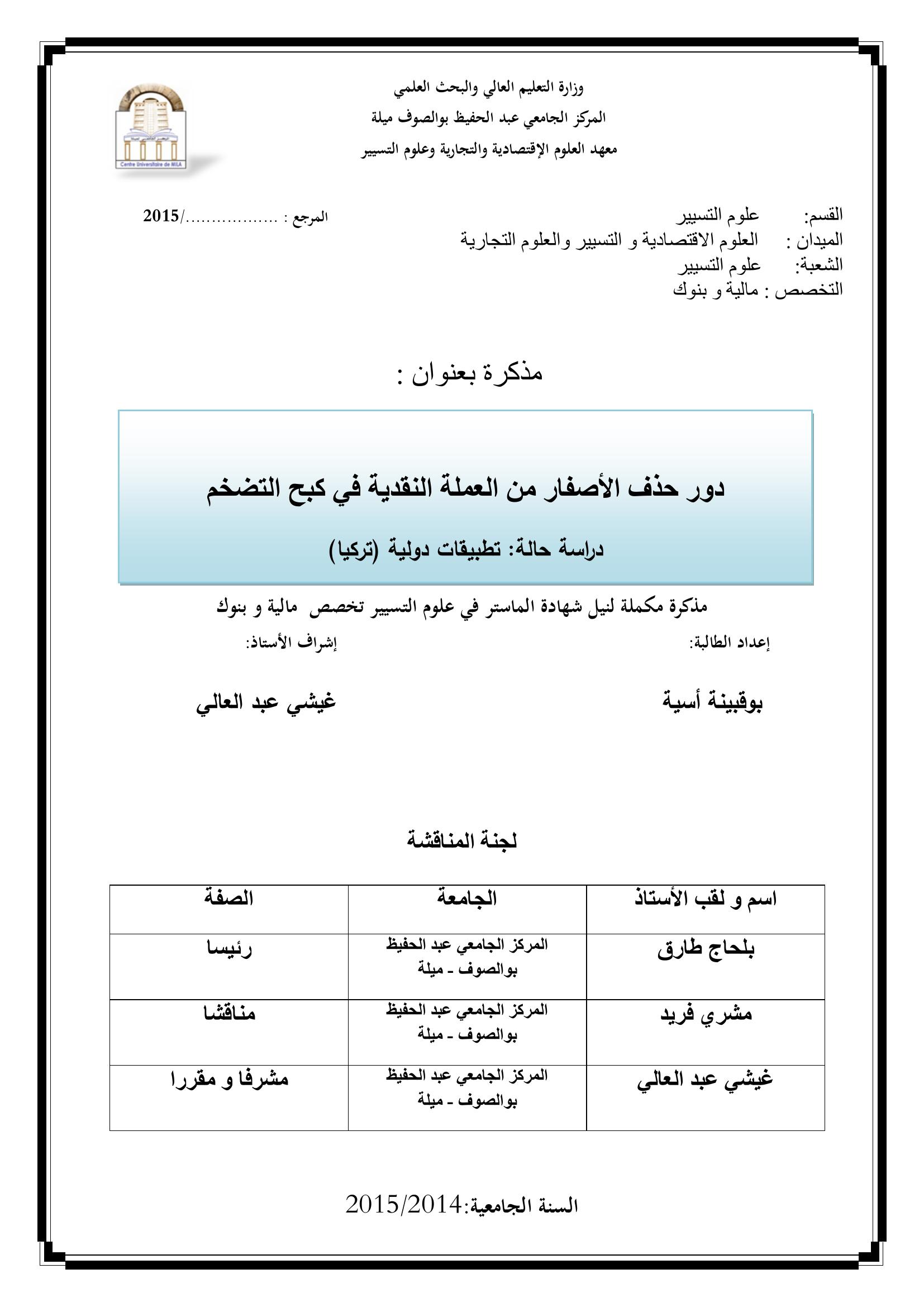 بوقبينة أسية & ،بلحاج طارق(رئيسا)، مشري فريد(مناقشا)، غيشي عبد العالي(مشرفا ومقررا) (2015). دور حذف الأصفار من العملة النقدية في كبح التضخم.