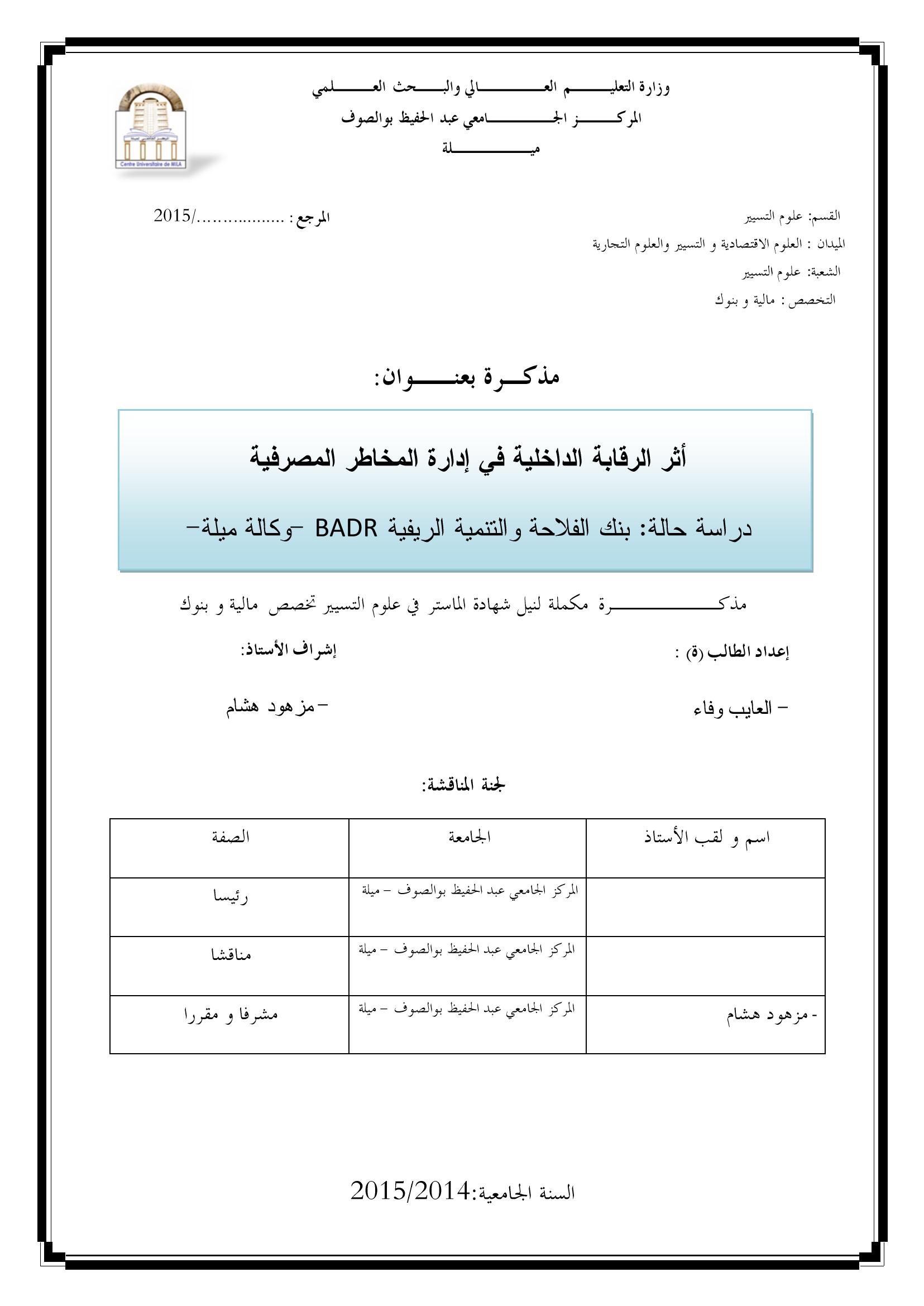 أثر الرقابة الداخلية في إدارة المخاطر المصرفية : دراسة حالة بنك الفلاحة والتنمية الريفية وكالة ميلة