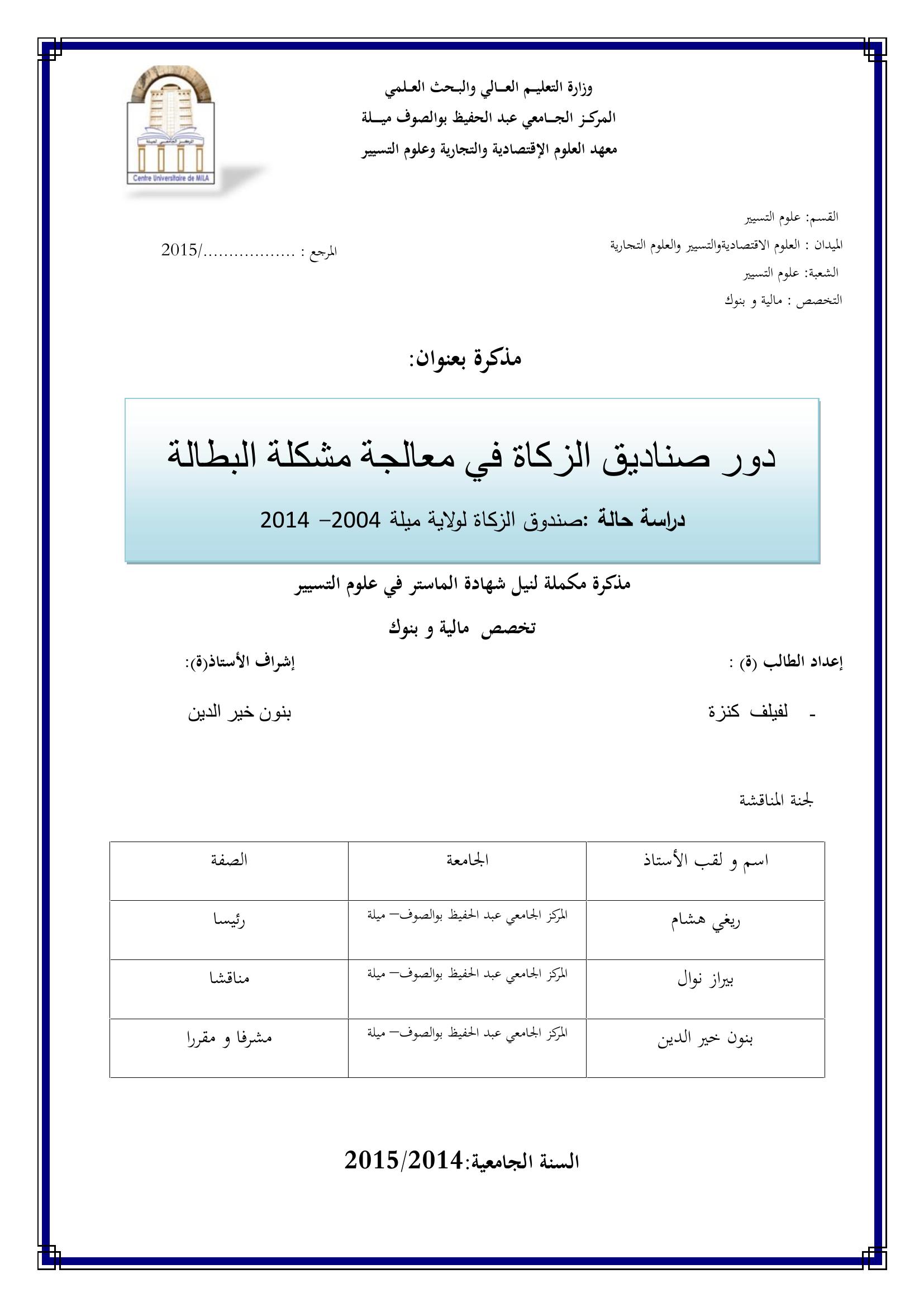 لفيلف كنزة & ،ريغي هشام (رئيسا)، بيراز نوال(مناقشا)، بنون خير الدين(مشرفا ومقررا) (2015). دور صناديق الزكاة في معالجة مشكلة البطالة : دراسة حالة صندوق الزكاة لولاية ميلة 2004-2014.