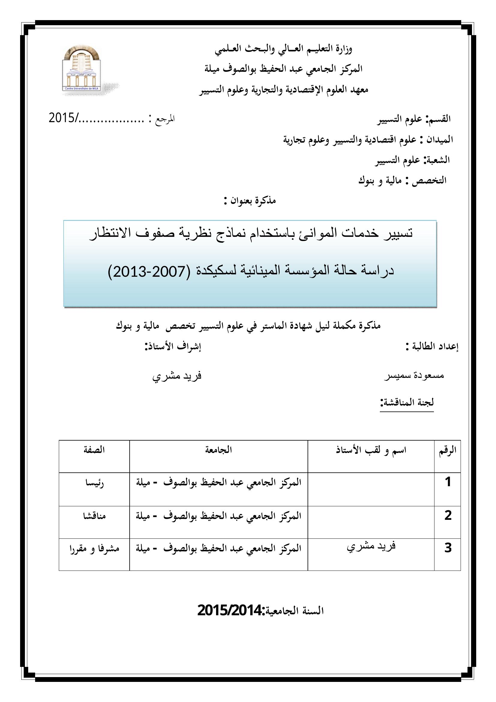 تسيير خدمات الموانئ باستخدام نماذج نظرية صفوف الإنتظار : دراسة حالة المؤسسة المينائية لسكيكدة (2007-2013)