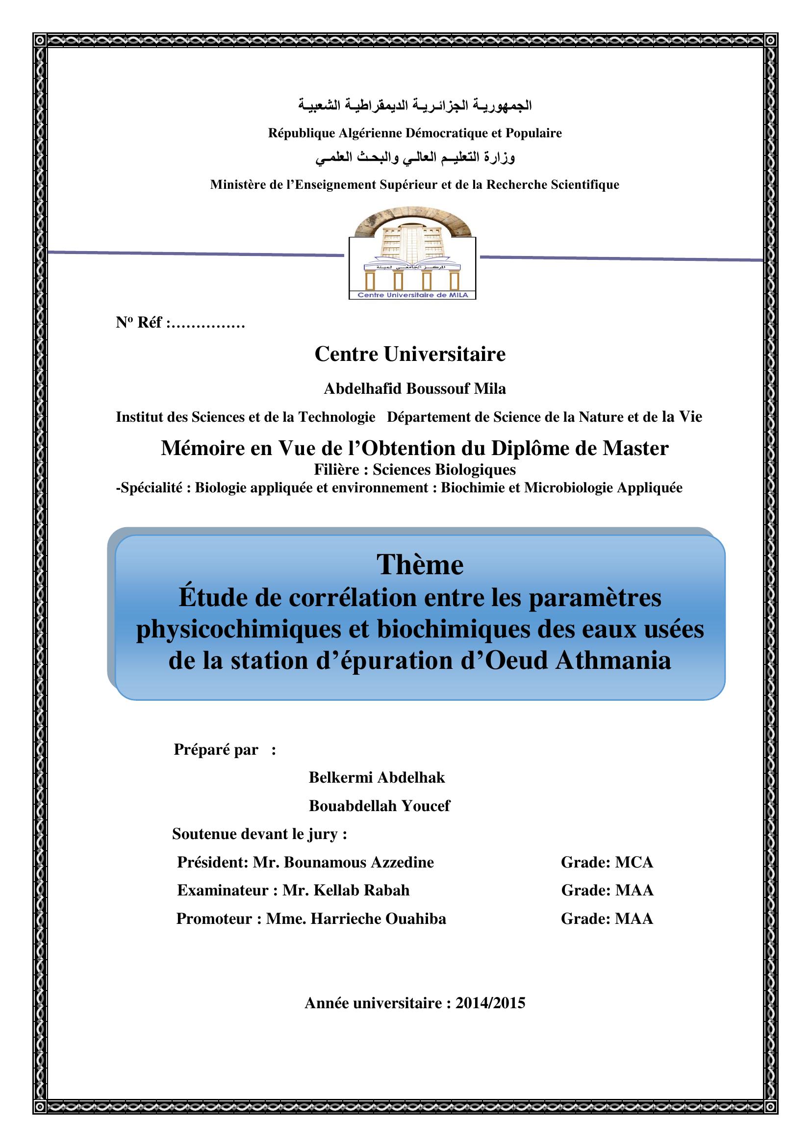 Belkermi Abdelhak & Bounamous Azzedine Président, K. (2015). Etude de corrélation entre les paramètre physicichimiques et biochimiques des eaux usées de la station d'épuration d'Oeud Athmania.