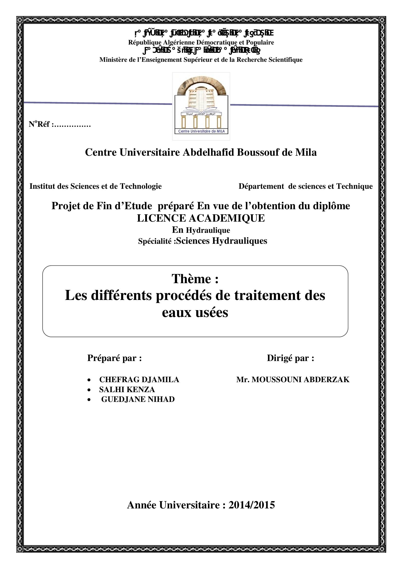 Chefrag djamila & MOUSSOUNI ABDERZAK encadreur (2015). Les différents procédés de traitement des eaux usées.