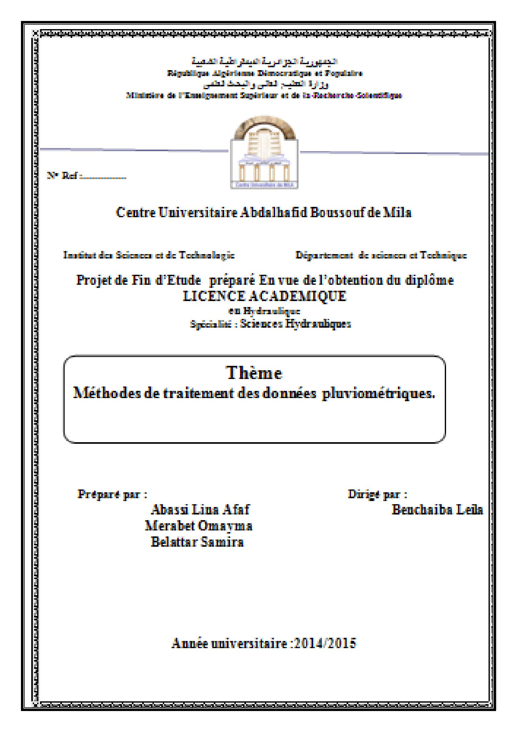 Abassi lina afaf & benchaiba leila encadreur (2015). Méthodes de traitement des données pluviométriques.