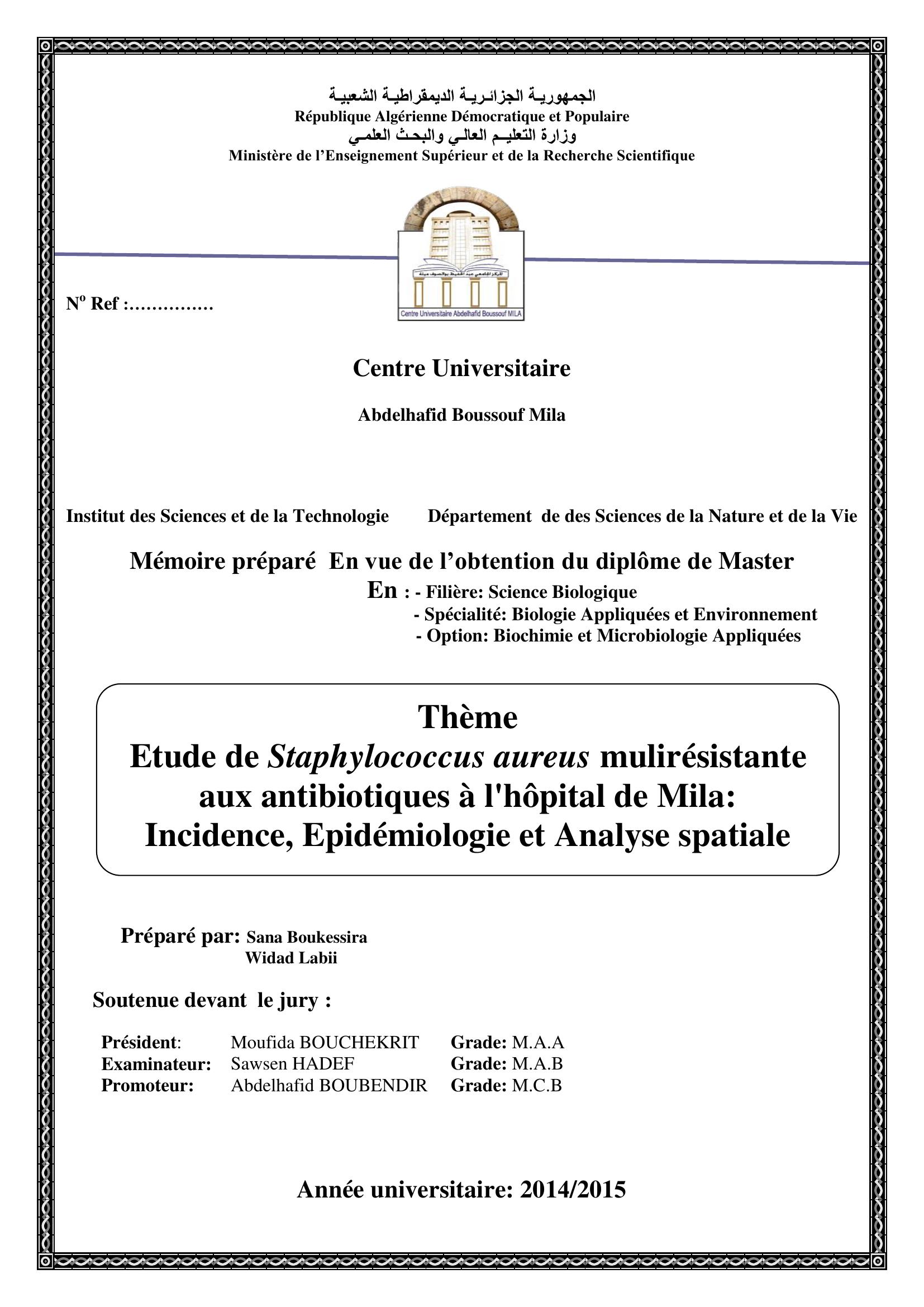 Boukessire Widad (2015). Etude de staphylococcus aureus mulirésistante aux antibiotiques à l'hopital de mila : incidence ; epidémiologie et analyse spatiale.