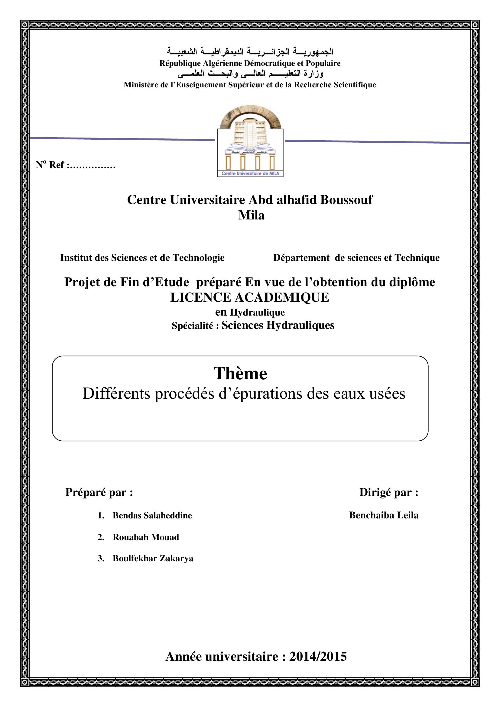 Bendas salaheddine & benchaiba leila encadreur (2015). Différents procédés d'épurations des eaux usées.