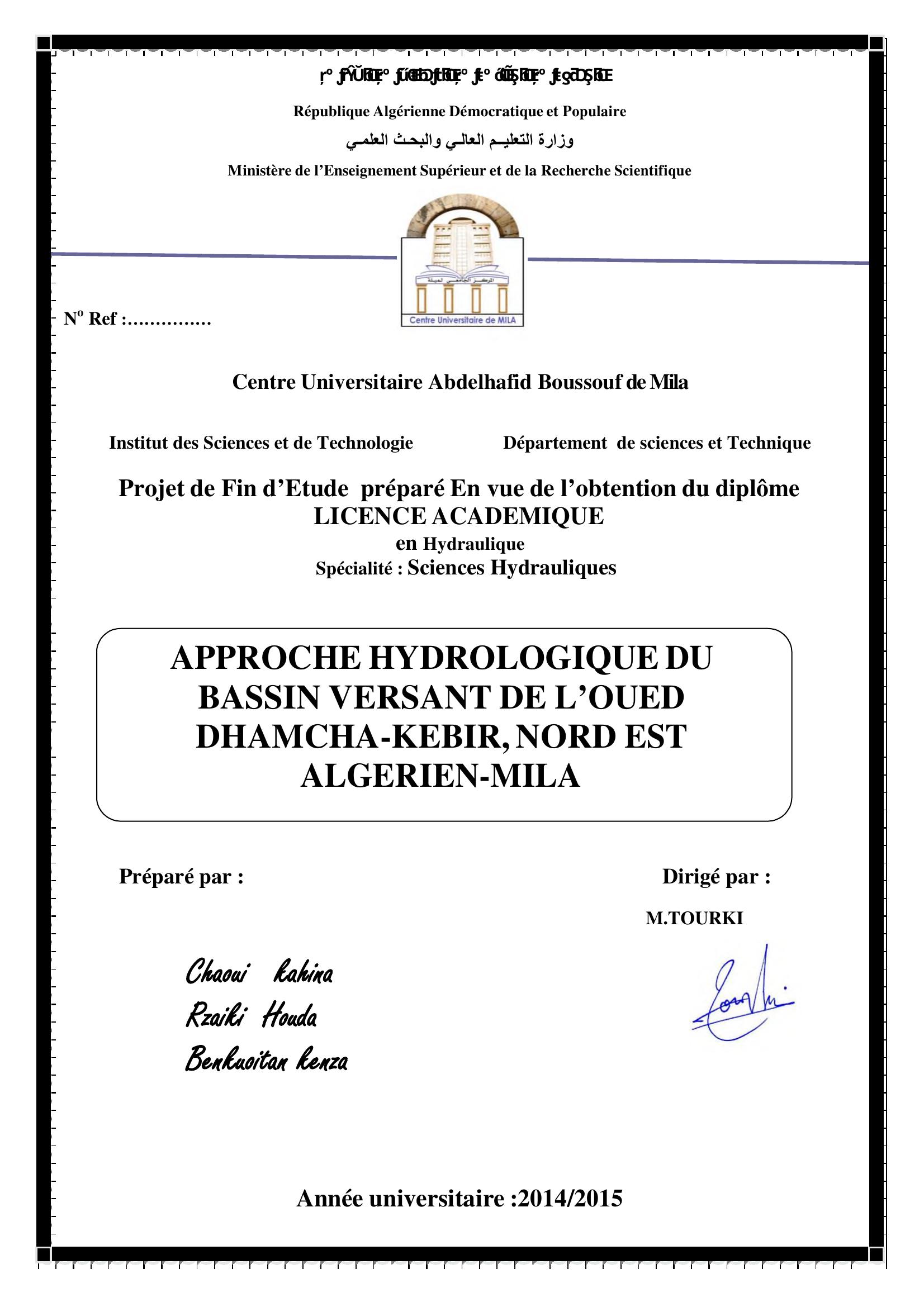 Chaoui kahina & M.TOURKI encadreur (2015). Aperroche hydrologique du bassin versant dl'oued dhamcha -kebir,nord est algerien-mila.