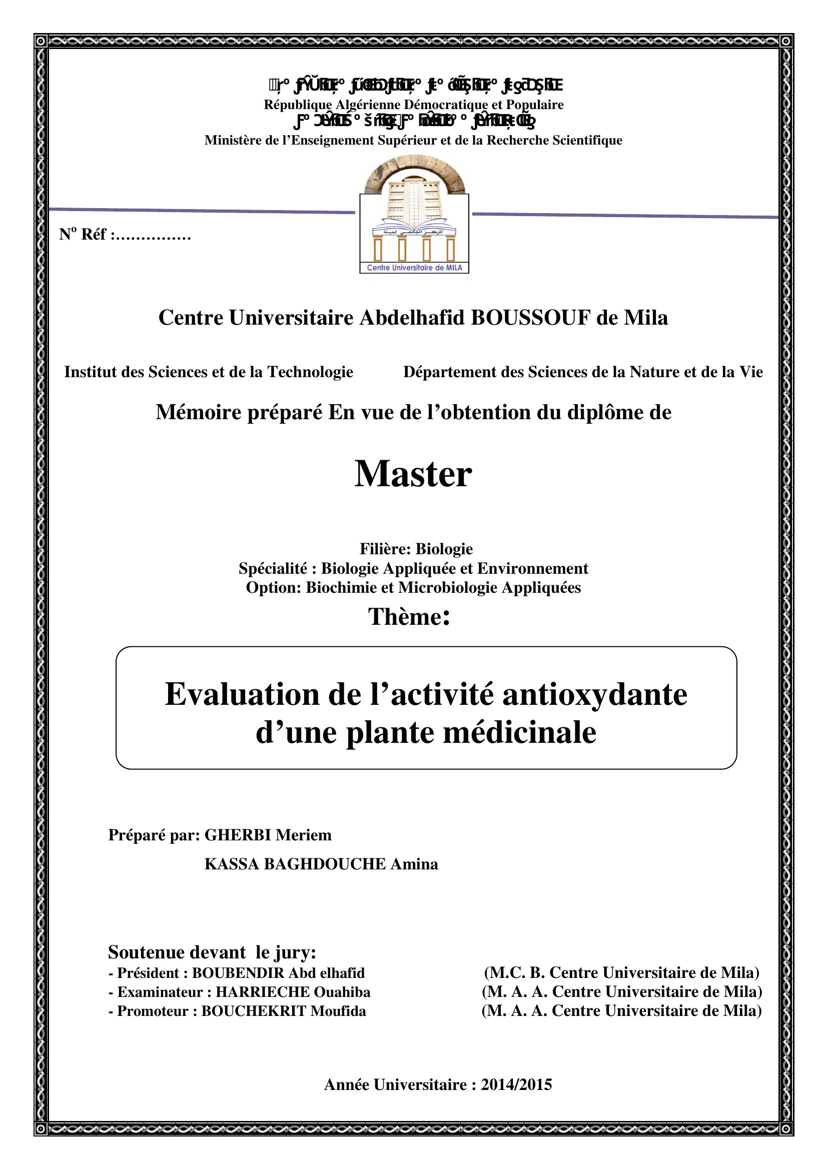 Gherbi Meriem (2015). Evaluation de l'activité antioxydante d'une plante médicinale.
