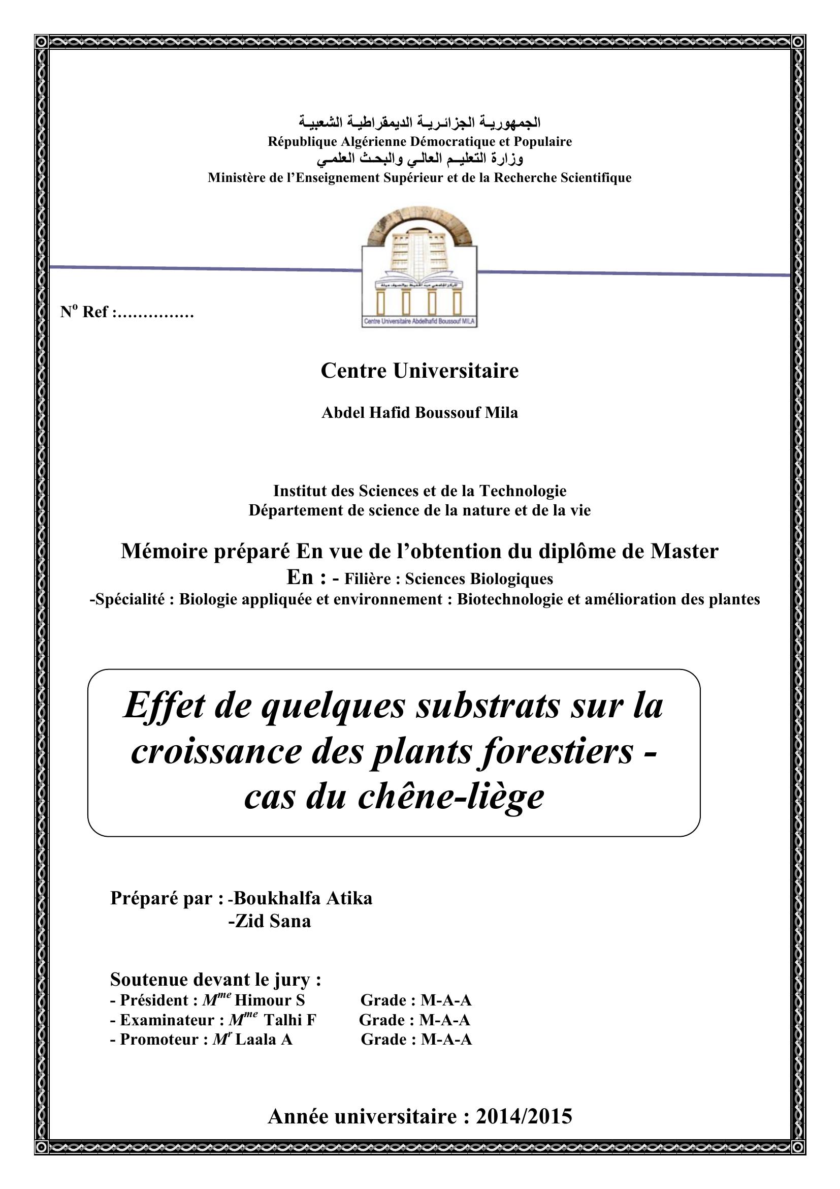 Boukhalfa Atika (2015). Effet de quelques substrats sur la croissance des plants forestiers-cas du chene-liège.
