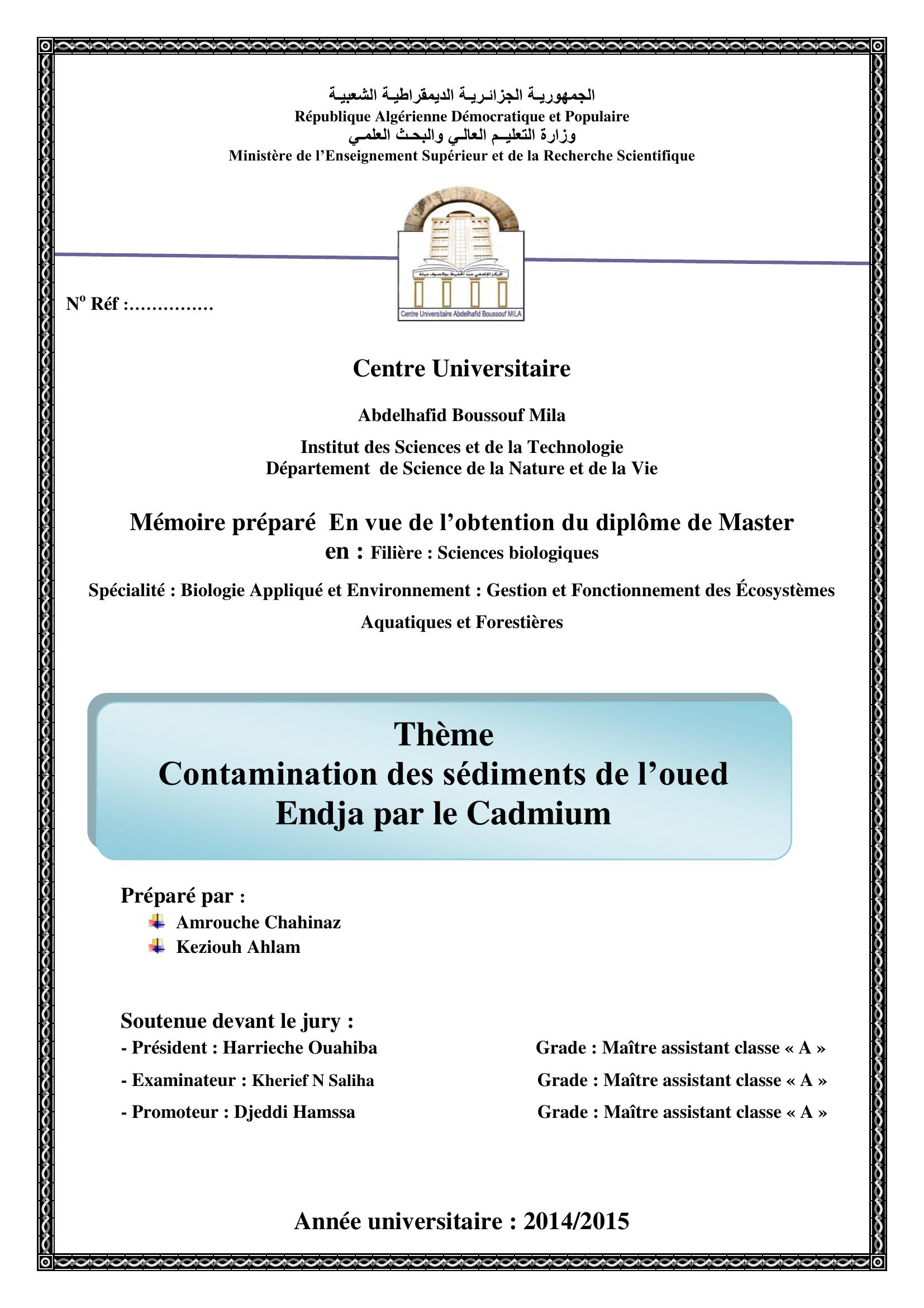 Amrouche Chahinaz (2015). Contamination des sédiments de l'Oued Endja par le cadmium.