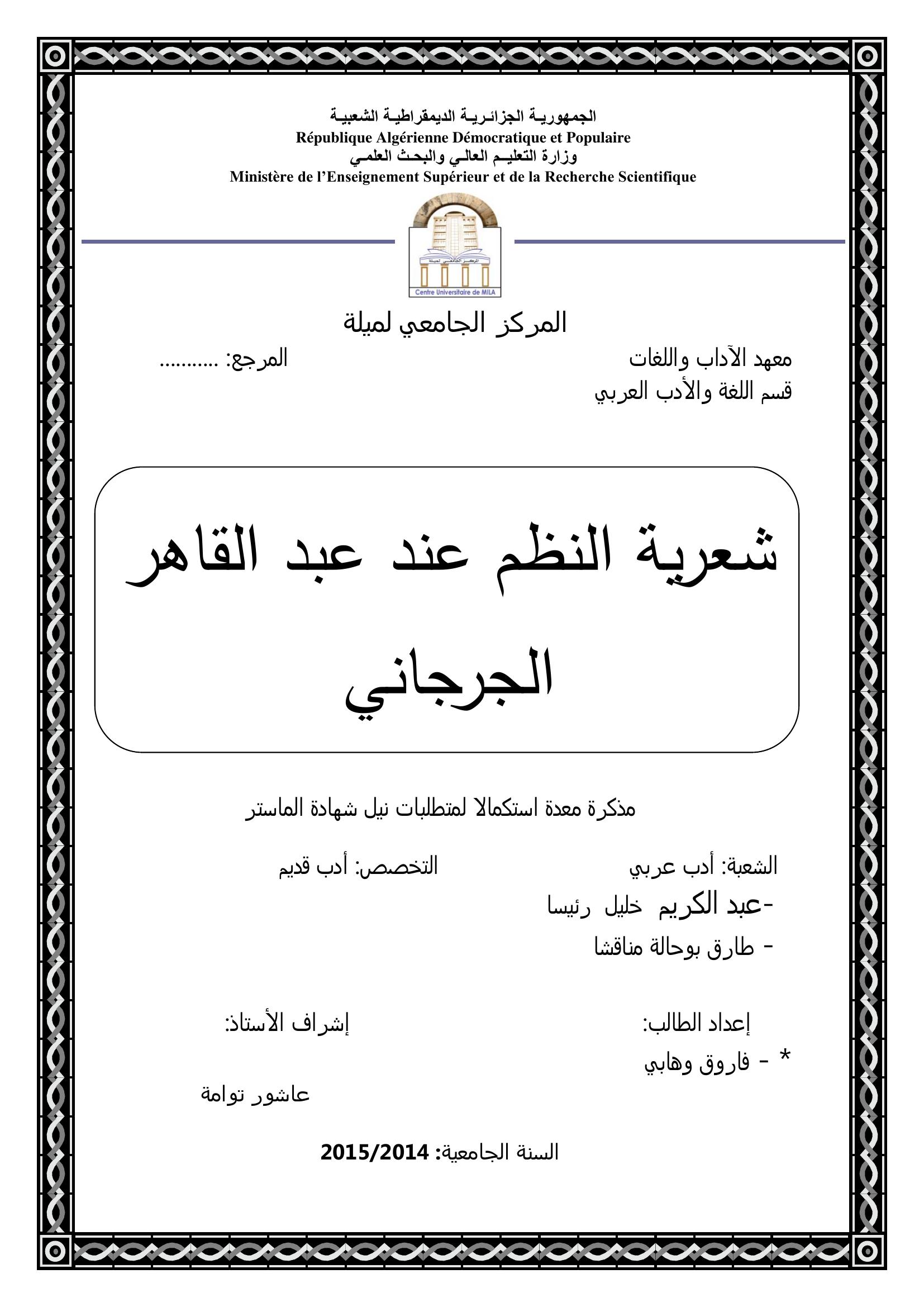 وهابي فاروق & توامة عاشور (مشرفا) (2015). شعرية النظم عند عبد القاهر الجرجاني.