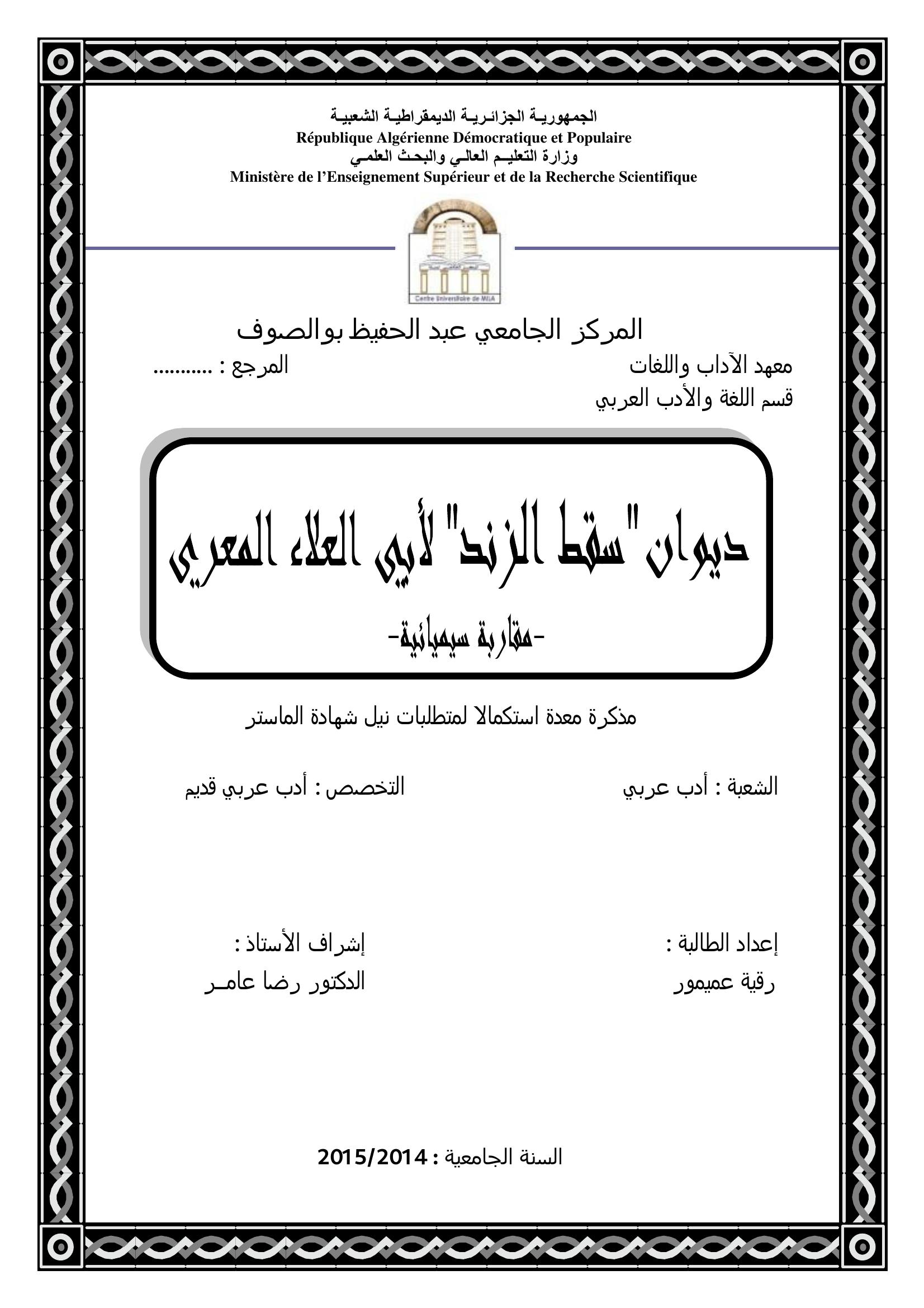 عميمور رقية & رضا عامر (مشرفا) (2015). ديوان سقط الزند لأبي العلاء المعري مقاربة سيميائية.