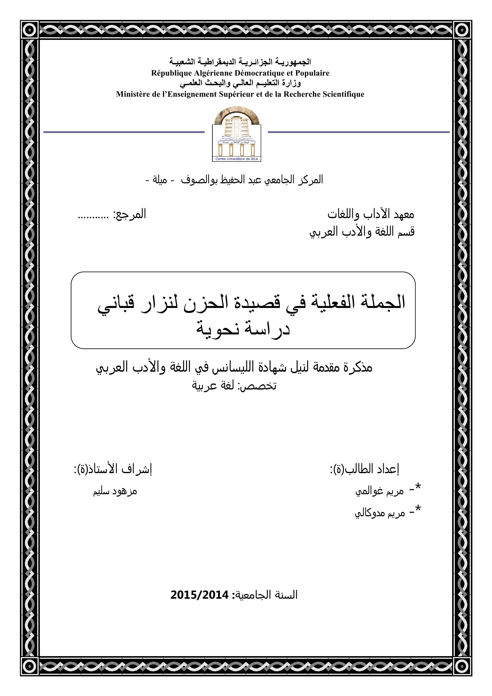 غوالمي مريم et al. (2015). الجملة الفعلية في قصيدة الحزن لنزار قباني دراسة نحوية.