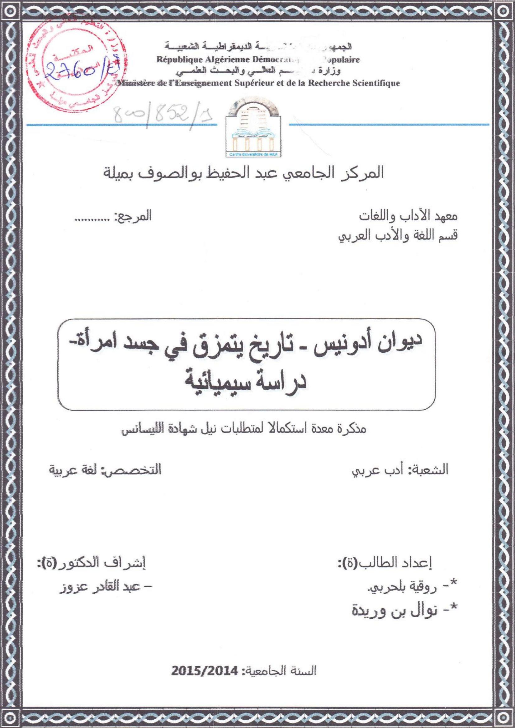 بلحربي روقية et al. (2015). ديوان أدونيس تاريخ يتمزق في جسد إمرأة دراسة سيميائية.