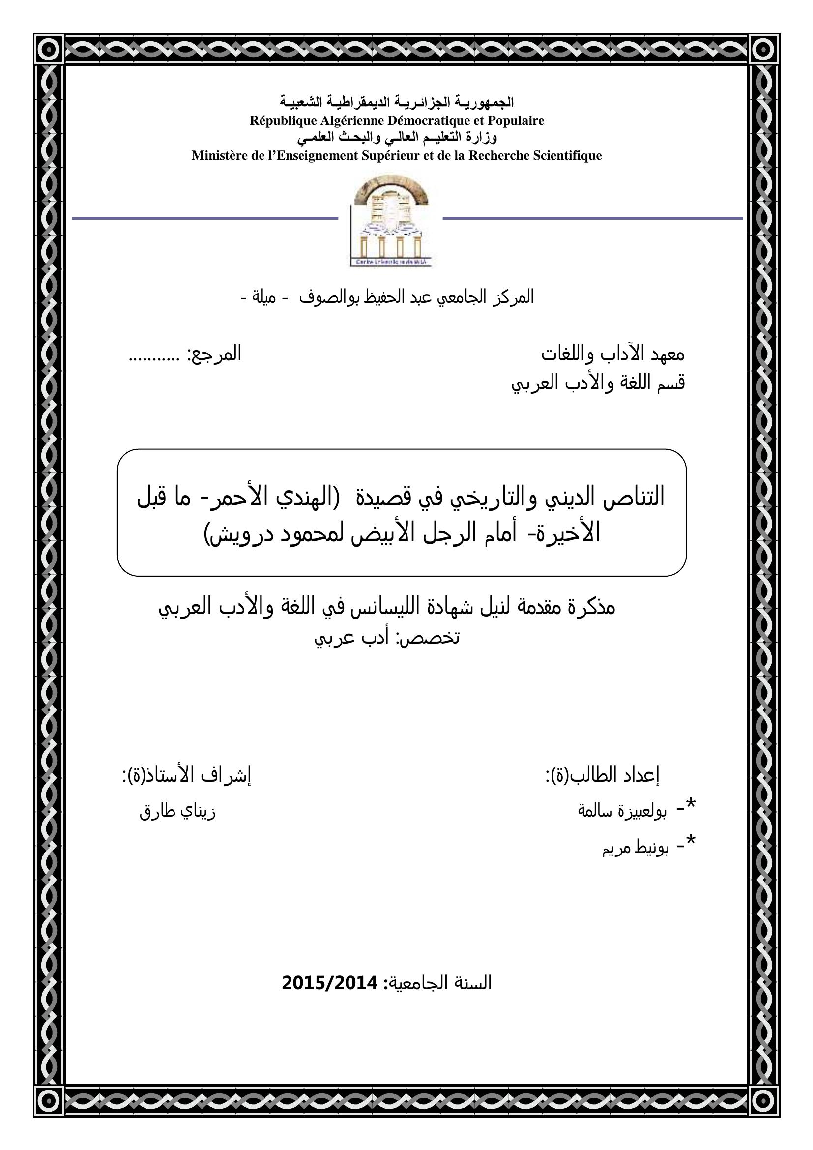 بلعبيزة سالمة et al. (2015). التناص الديني والتاريخي في قصيدة الهندي الأحمر ماقبل الأخيرة أمام الرجل الأبيض لمحمود درويش.