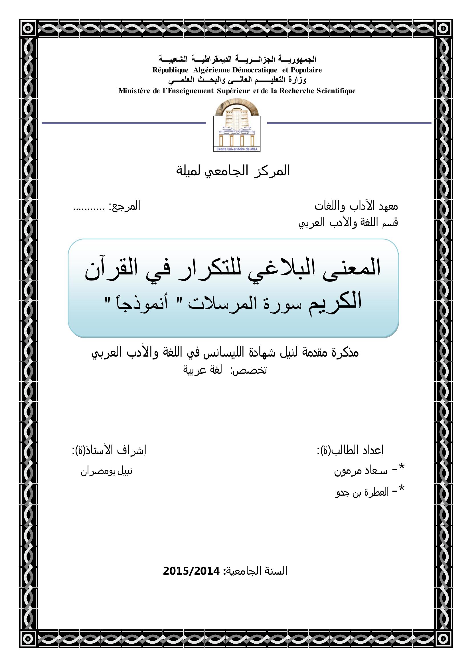 مرمون سعاد et al. (2015). المعنى البلاغي للتكرار في القرآن الكريم سورة المرسلات أنموذجا.