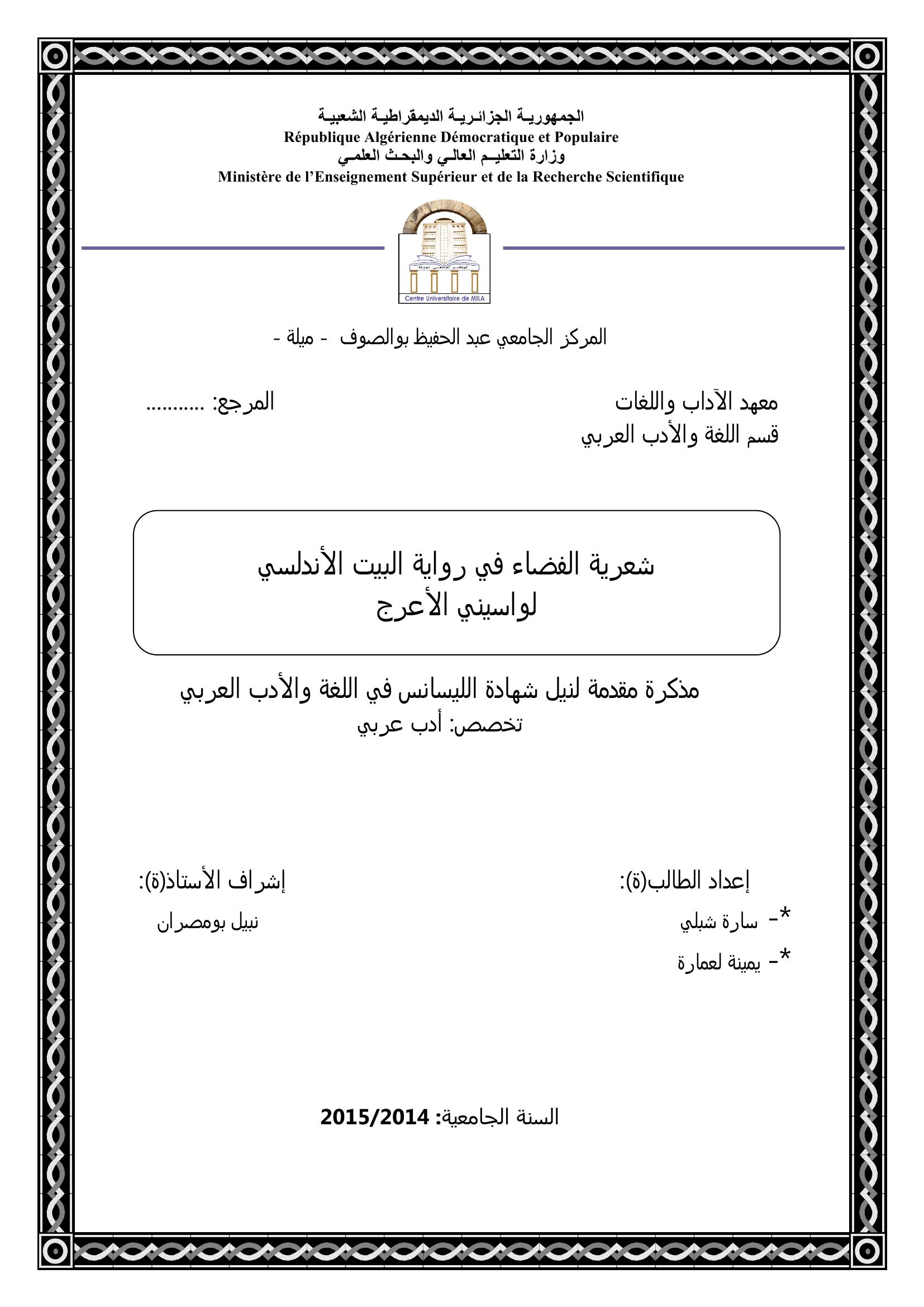 شبلي سارة et al. (2015). شعرية الفضاء في رواية البيت الأندلسي لواسيني الأعرج.