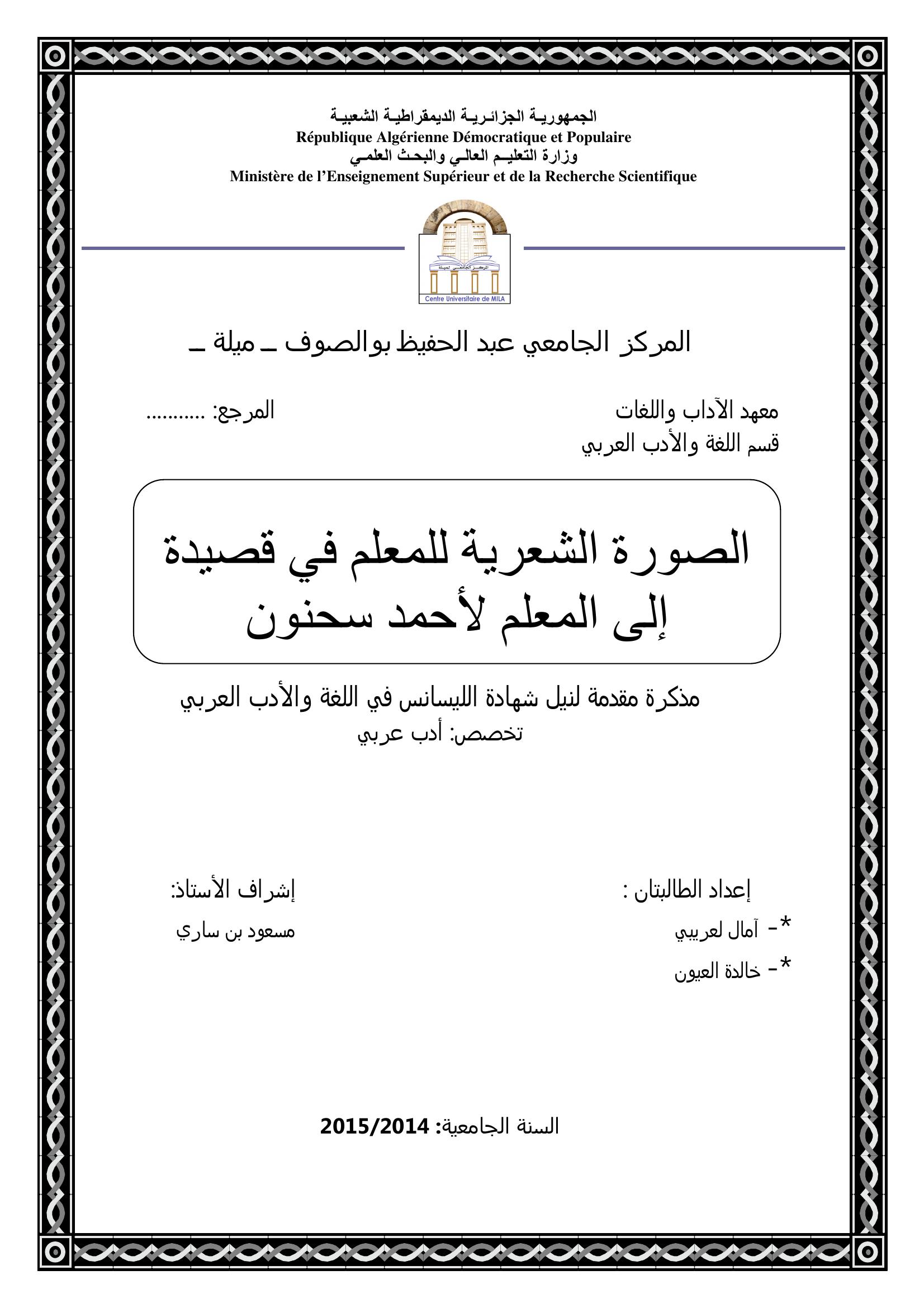 لعريبي أمال et al. (2015). الصورة الشعرية للمعلم في قصيدة إلى المعلم لأحمد سحنون.