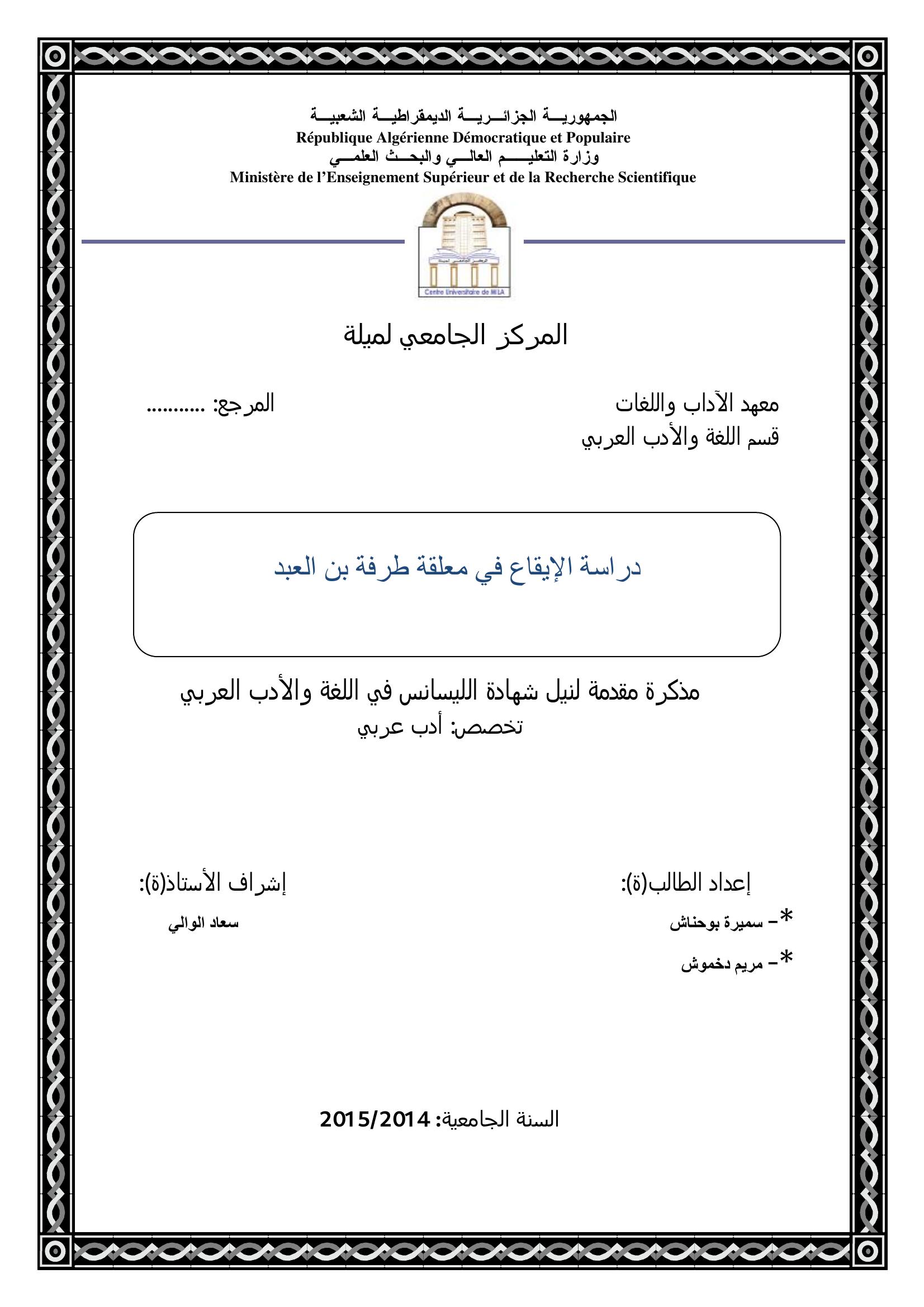 بوحناش سميرة et al. (2015). دراسة الإيقاع في معلقة طرفة بن العبد.