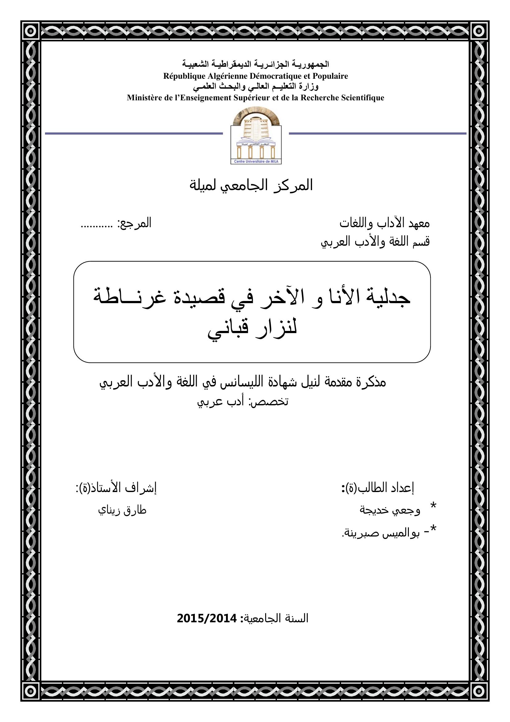 وجعي خديجة et al. (2015). جدلية الأنا والآخر في قصيدة غرناطة لنزار قباني.