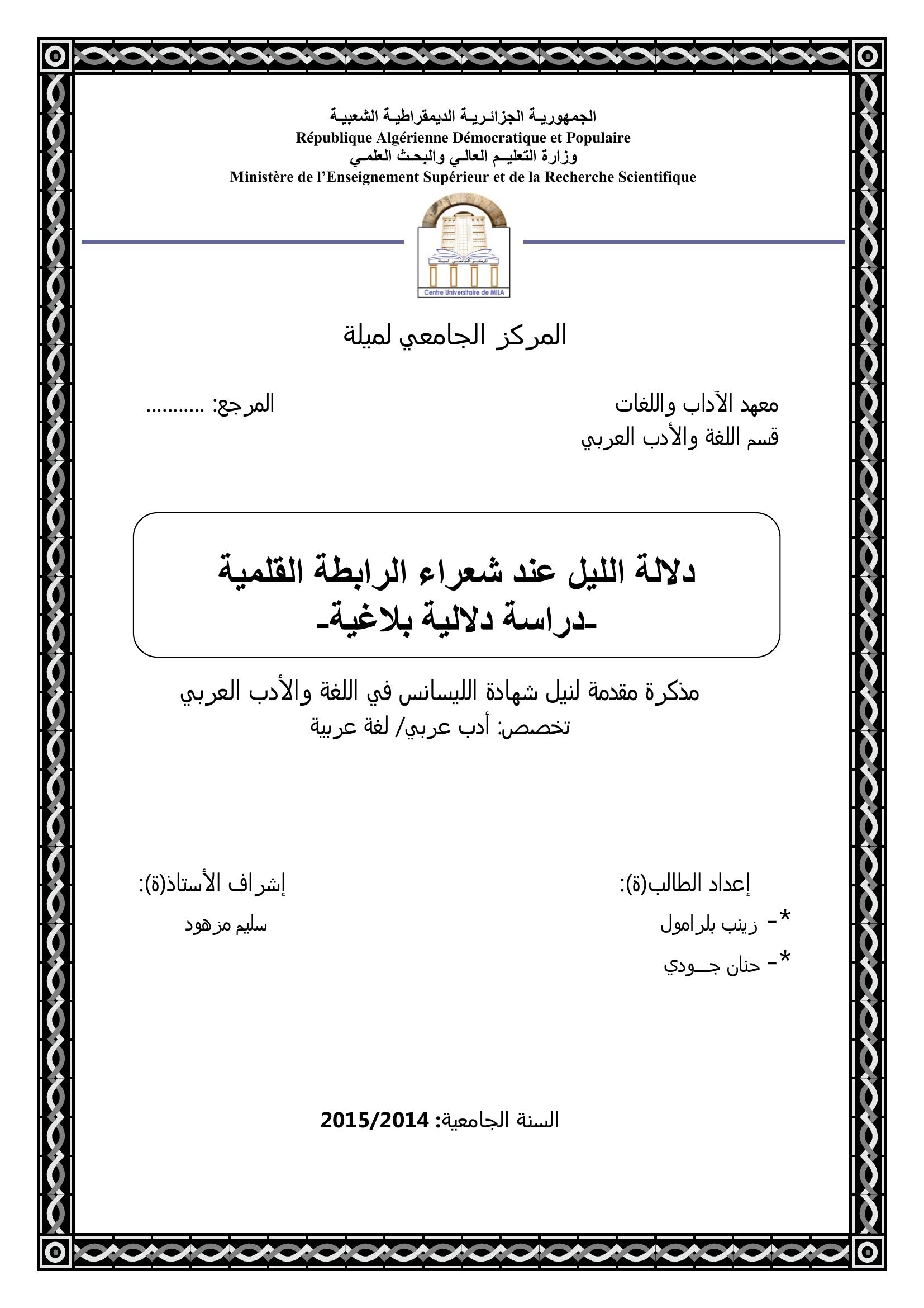 بلرامول زينب et al. (2015). دلالة الليل عند شعراء الرابطة القلمية دراسة دلالية بلاغية.